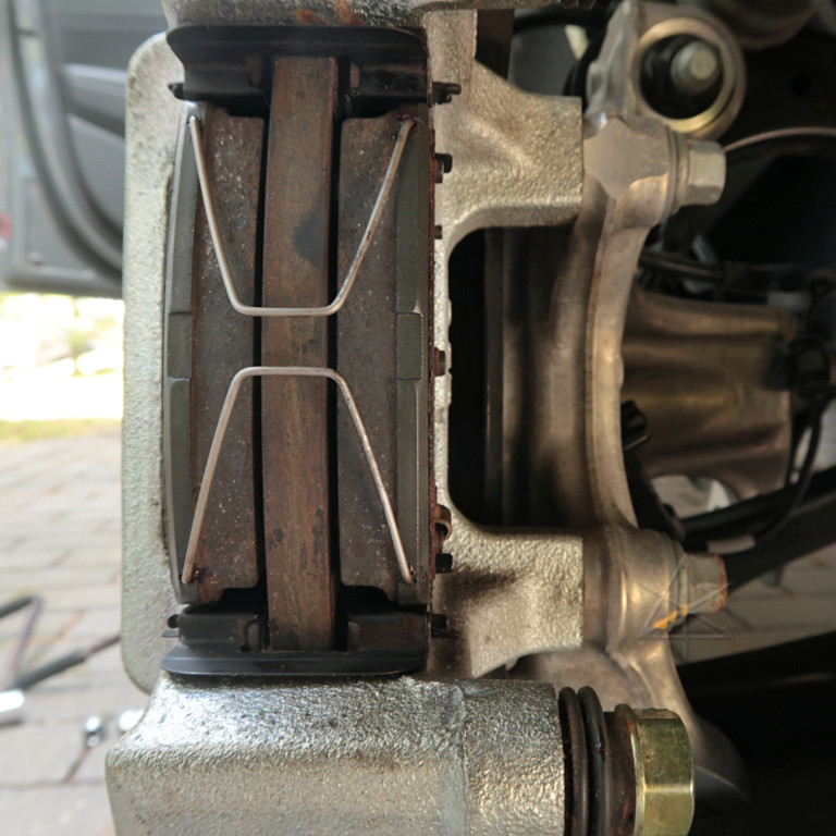 The inner and outer pads are clearly different, and have the anti-squeal shim plates integrally attached. |