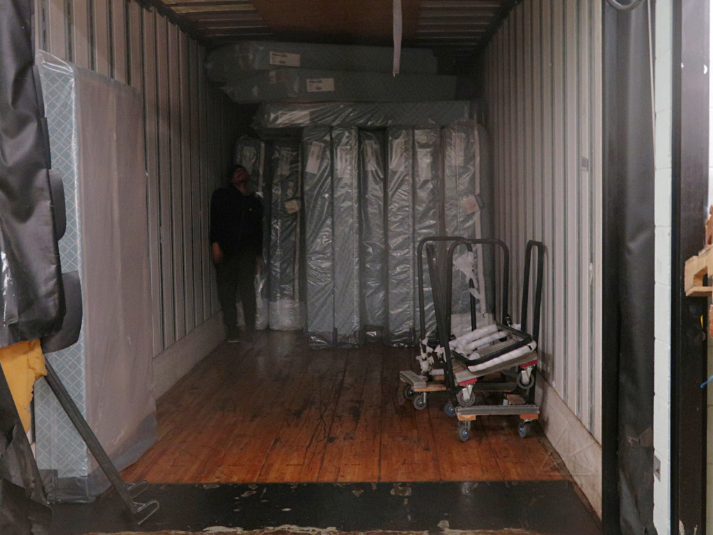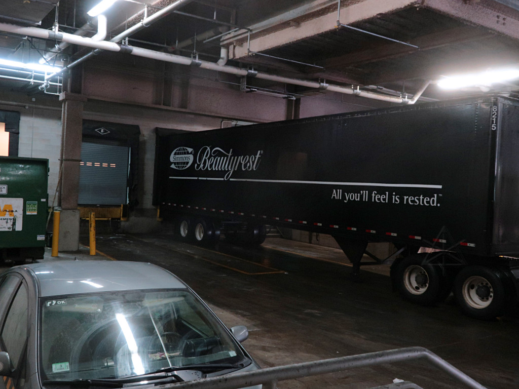 | Our load-and-go at home was a bit more leisurely, since Mark was picking up the Penske that morning instead, and I arrived at the hotel a little before noon. In distinct contrast to last year when we could start unloading a little earlier than our official pickup time, this year was a mess. The ballrooms were still in use, and the ongoing renovation activity upstairs had everything jammed up on the high-side docks ... part of which apparently included a whole lot of new beds. |