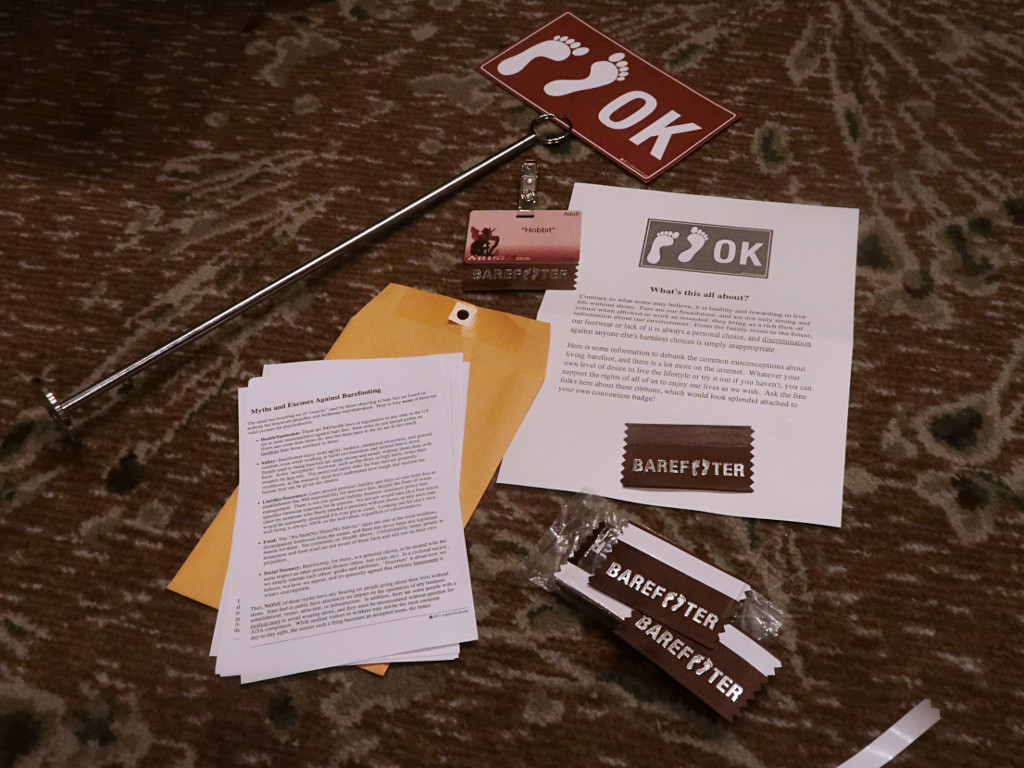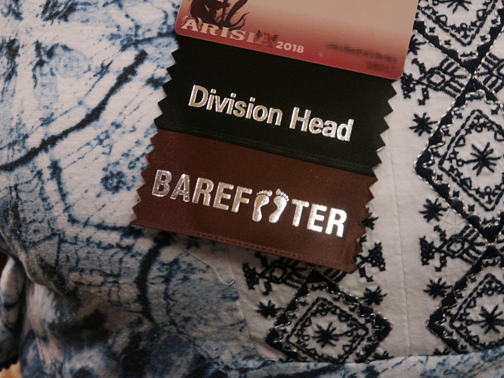 Many Arisians want the barefoot preference to cease being some kind of "issue", because frankly it's simply *not* an issue. It's a healthy and harmless part of who some of us are, both within and outside of the convention. To that end, over the summer I pursued some ideas for bringing better education and visibility to anyone interested. This included creating a batch of badge ribbons as a grassroots token of support, using the same awards company that all of our other ribbons come from. I also reached out to some known stronger sympathizers to try and bring them on board with the effort, at the possible risk of boring them silly with my long-winded verbiage [callously denigrated as a "manifesto" by some, apparently]. It was a pleasant surprise when a side discussion came up at the first concomm meeting, *not* started by me, to the effect that we all desperately wanted this to be a non-problem on all fronts. |