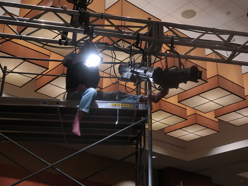Then I headed to the Aloft to check in and figure out where to put the car -- turned out there was plenty of room in the lot a block away, for not a huge financial burden, so I went for it and they conveniently added that right onto the room bill. Some people apparently didn't like the relatively compact "euro" style of the Aloft rooms, but I found ours perfectly functional even if appointed in a somewhat millennial-trendoid feel. And because I opted out of daily bed changes, they kept throwing $5 food coupons under the door. Tilting back to tech All this kept me off-site for more of the afternoon than in previous years, which was actually convenient relative to the build timeline. When I finally wandered in, tech things were well under way and the truss rig was close to finished, which I mostly stayed clear of unless someone had a specific question or a piece of gear I needed.