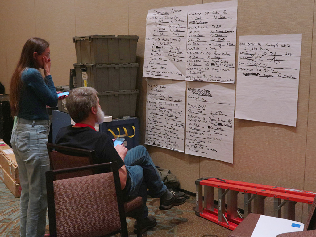 I was actually rather pleased with how Bellydance turned out; if anything the Rokboxes were throwing more light on the dancers than the main rig, and looked a whole lot better than boring old tungsten warm/cool. The low "shinkicker" angle was also entirely appropriate, for a dance style traditionally illuminated from fires on the ground, and the dancers were sort of framed by their own imposingly tall shadows out at the edges of the cyc. I could also get plenty of punchy color on them, because that's what multi-emitter LEDs are great for. By dumb luck, perhaps, a reasonable stage picture, and since nobody else seems to have captured any of it either, the only record I would likely ever have would be the video once it got processed and released. I still wanted to get a better handle, so to speak, on setting up the board. I had another event coming up where I'd need to do more things on the fly, and wanted more of the rig immediately functional to do that. An in-depth chat with Daniel later that evening gave me some good ideas. |