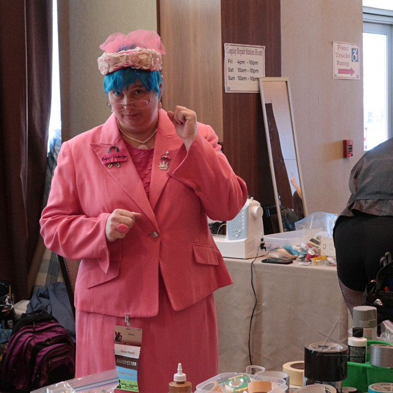 That, in fact, was a great theme for the Photo Booth which was right next to us. I didn't pay much attention to it as it seemed to mostly be about costumes, but then some of their people offered "want a picture?" and I happened to spot the completely appropriate sign among their selection so I went for it. Doing the one-foot thing again, as I've taken to doing frequently when I'm just standing around, just for the balance practice. It took a while post-con to eventually find the shots, somewhere on Page 18 of the set, which seems to be a bit chaotic and span multiple years. That's probably Flickr's fault. The best of the lot seemed to be this one, but needed a bit of fix-up in post so my rework is the thumbnail and larger image shown here. |