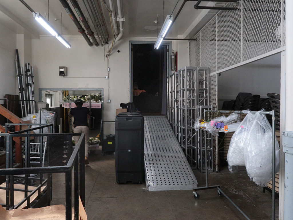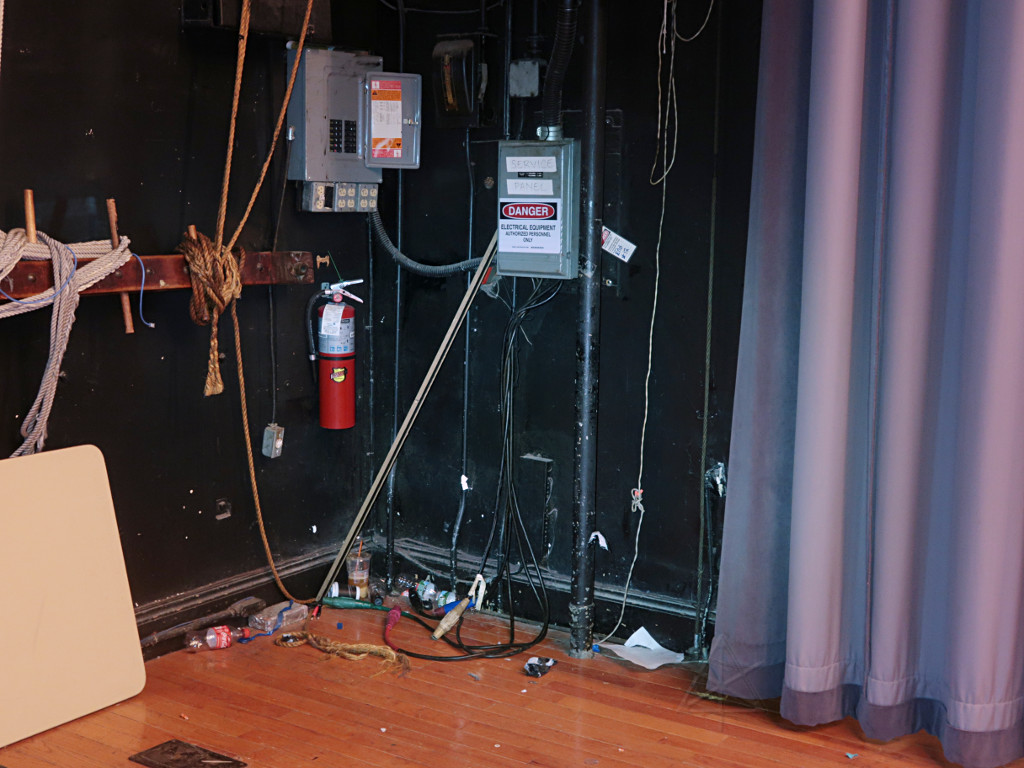 Risers for the rooms are conveniently stored under the stage itself. Note the mousetraps, too... |