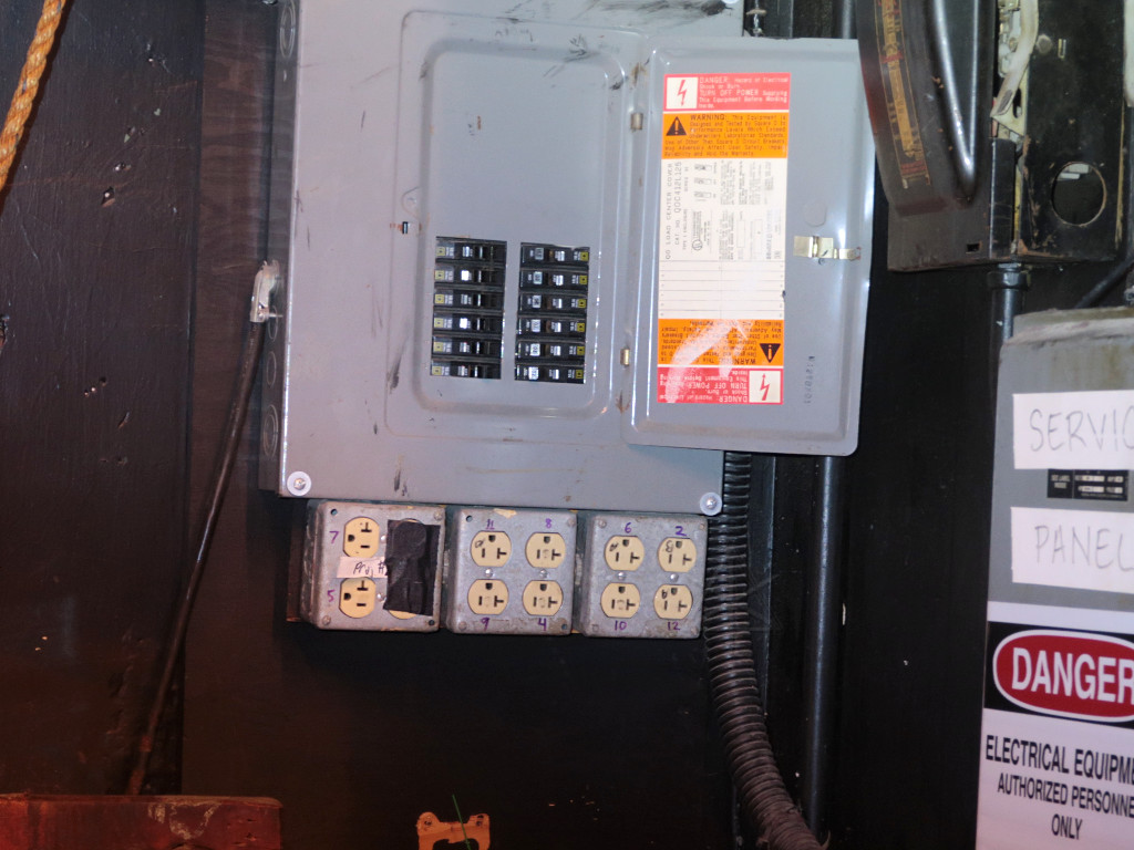 The old incandescent strip-lights are fed three circuits apiece, via some *really* scary-looking old plugs into high-mounted wall sockets. They probably haven't moved in fifty years. |