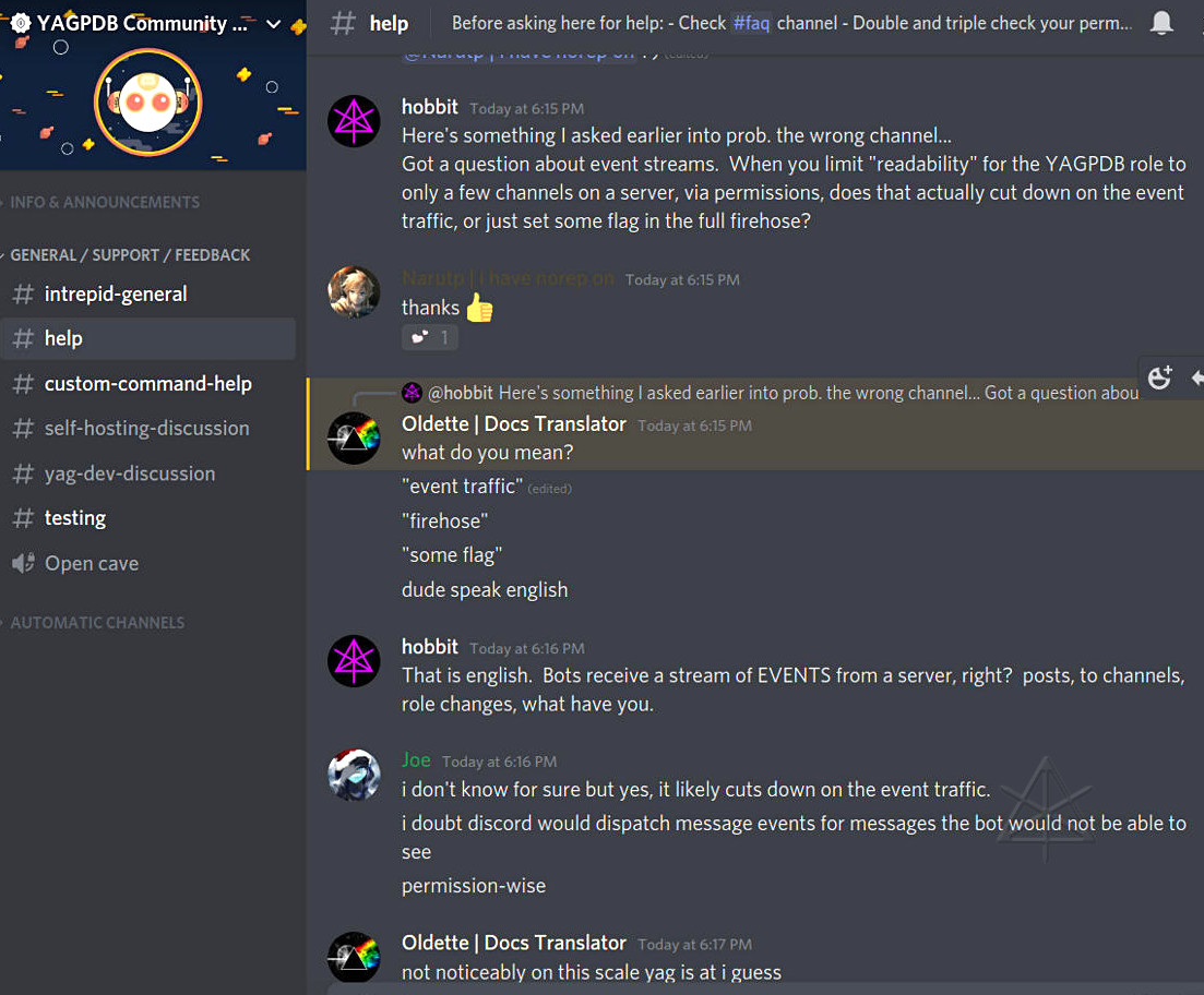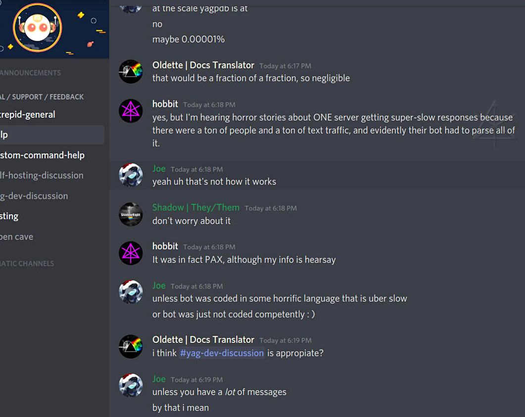 | Discord bots connect to Discord's infrastructure at an intimate API level, and once enabled into a given "guild" or server, begin receiving a massive stream of events. These can be anything from ordinary channel messages to any administrative changes, arrival and departure of users, rearrangement of channels and roles and permissions, connect and disconnect to audio/video channels, etc. In most setups, the "bot sees all" because it's often serving to auto-moderate conversation traffic, but now I was curious whether Discord's infrastructure would honor its own permission structure and withhold events that a bot's permissions would prevent it [as a "user"] from receiving. In other words: would disallowing a bot's purview of most channel traffic physically limit the number of "regular" events being transmitted? Most bots have their own support servers, so I went off to those to try and find out. |
