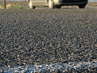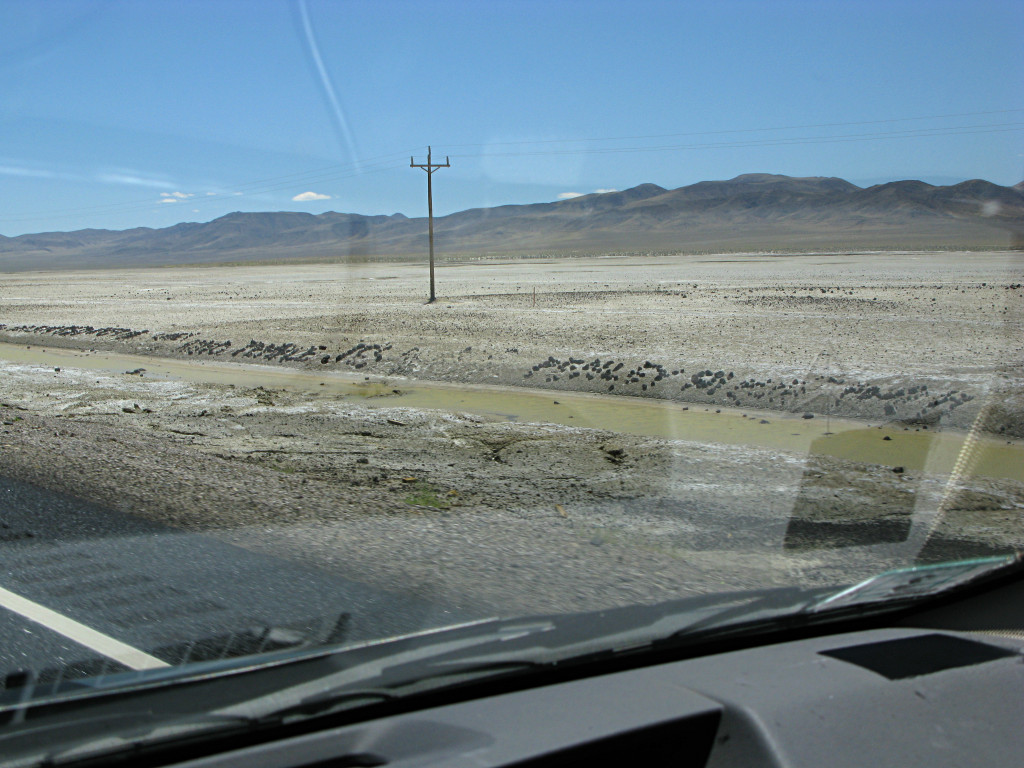 The road goes along between these alkali salt flats for many miles, and the