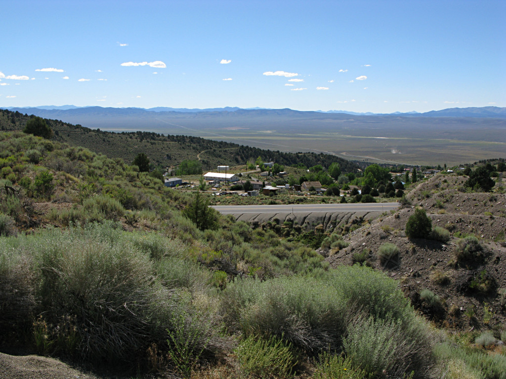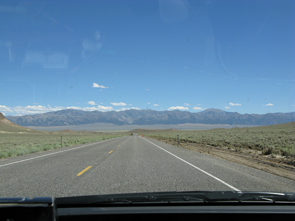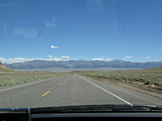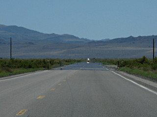 In general, a constant-power scenario of letting speed drop a bit on the uphills and getting it back on the downs tends to be more efficient than trying to push hard up the hills and then have to brake more on the backside. Some vehicles have no choice about this, where a lower horsepower-per-ton ratio is accomodated with climbing lanes and "flashers under 40 MPH" signs and the like. On just starting one of these rises somewhere between Eureka and Ely, I noticed a semi quite a ways back from me just before going around the first bend and losing sight of it. I figured it would eventually overtake and pass but probably way after negotiating this ridge. |
