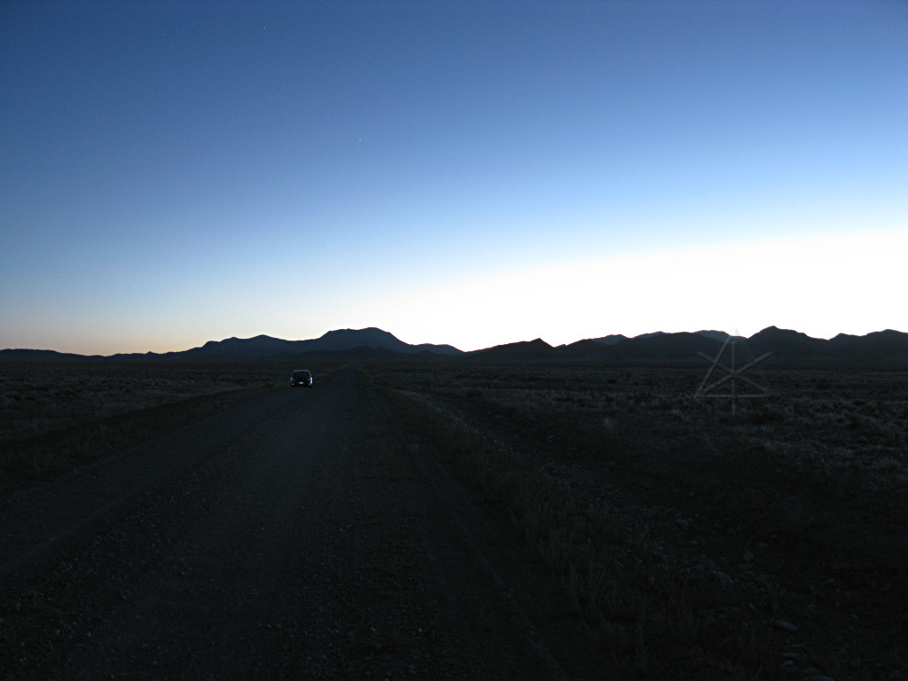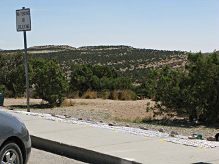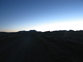 If you want to get every part of your car bouncing vigorously up and down, try going down a sand road as washboardy as the access road into here was at the time. OMFG. I thought my instrumentation, both built-in and add-on, was going to fly apart into tiny electronic chaff. The mere process of slogging into there and back out knocked a full 2 MPG off my average, 100 miles into the tank. But I pushed on, past the RV that's just starting outward here and through its dust cloud, and finally got closer to the base of the mound. | |