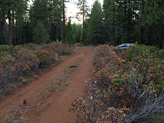 But as I went on I realized that with so many little offshoots and so little passing traffic, there was no way anyone was going to go poking far enough up each and every one of them and check for interlopers. I had no other choice at this point, and used the last bit of remaining daylight to pick my way far enough up one of these paths to be out of sight from the road, tucked the car in behind some bushes to hide retroreflections and be clear of the path in case a log truck *did* want to come past here in the morning, and called it my home for the night. I still had food in the cooler, so I was all set. |