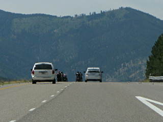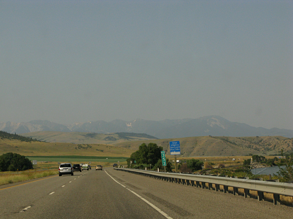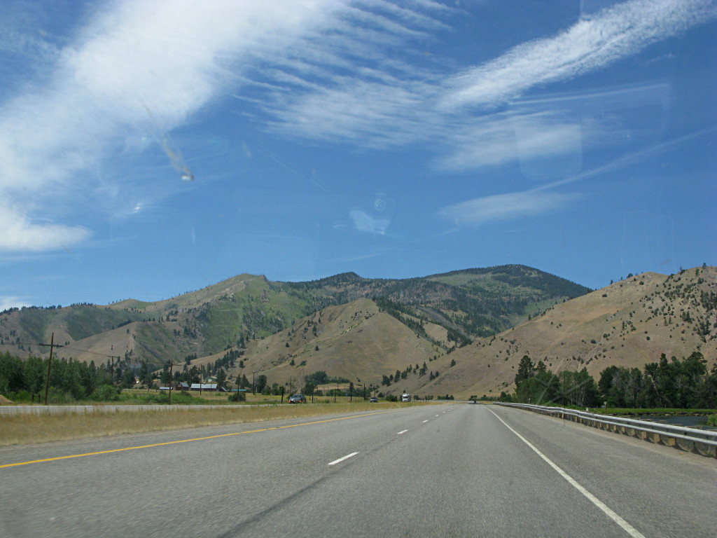 | As the day wore on it started to feel like more and more of a challenge to actually get out of Montana without going stark raving mad. It's a very big state, and I wasn't even doing its whole length since I had entered from the south via I-80. After Butte, I-90 heads up a bit farther north than I wanted to go, and it was time to play on the backroads again so in Missoula I got off the interstate and made a quick stop at a store for some food supplies. Then I got onto Rt. 12 to go over the Lolo Pass and head southwest toward Idaho that way. |