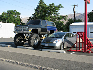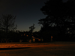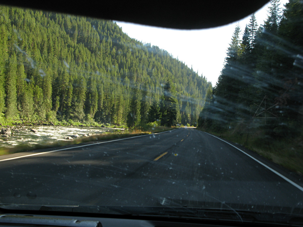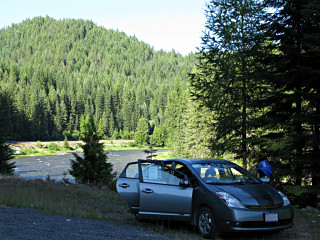 I pulled into one called Apgar and found that it was unattended registration, that simply wanted me to drop $8 into an envelope and pick a spot. But all I had was twenties and I didn't want to overpay, which in hindsight was really unfortunate because it would have been an absolutely *gorgeous* spot to overnight -- deep trees, right near the river with its steady white-noise lulling me to sleep. There was apparently nobody else in it who might have been able to make change, so I wandered out again and continued on, rounding rocky outcrop after rocky outcrop and watching the gas gauge drop from two "pips" left, to one, to ... Well, then I suddenly came across the tiny town of Lowell, that isn't even listed in the GPS database, but there's a gas station there. Overpriced at $4.60-something, of course, as any "last gas for X miles" sort of place would likely be, but I threw a couple of gallons in [which I don't like doing because it somewhat screws with my tank-to-tank recordkeeping] and it gave me some peace of mind. With that I could make Lewiston and the WA border if I had to, but now I was into the idea of using those NPS campgrounds. Unfortunately, the next and *last* one along this stretch was completely full. But a guy in its spot #1 who evidently spends much of his summer there told me that there were actually some *free* RV spots near the back of the city park in the upcoming town of Kamiah. He was also intrigued by the car and we chatted about hybrids and energy for a bit -- the usual story played out here: strike up a conversation, hand off a flyer, etc -- but I still needed a place to sleep. It was then a choice between going back to the other campground with my newly-obtained change or making more progress, and I opted for trying to find said free spots or failing that, just some random parking lot to pull into. As dusk began to fall I saw one or two RVs in the riverside pull-offs that really looked like they were fixing to bed down for the night, but I was concerned that if I did the same and they knew/had something I didn't, I'd have park rangers rapping on my windows at 1 in the morning. Having seen some oddly complex park permitting structures in other places, I had no idea what the local restrictions might be. And Kamiah wasn't that far ahead by now. One learning experience on this trip was that just because a town is listed on a map or in the GPS, doesn't mean it's actually got any *resources* for people traveling through. There are a few dots with names by them that look the same size on the map, but for each one it's a total crapshoot if there's even anything recognizable as a town there other than maybe a couple of houses, let alone a gas station that's open. A little more thought about where to fuel up is definitely needed out here where distances stretch much longer than back home, with considerably less civilization and infrastructure in between. So I had no idea what I'd find in Kamiah, or if I would even know when I was in it. |