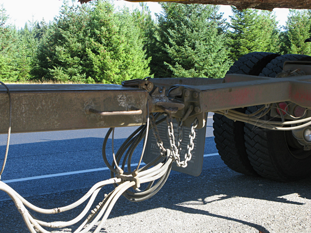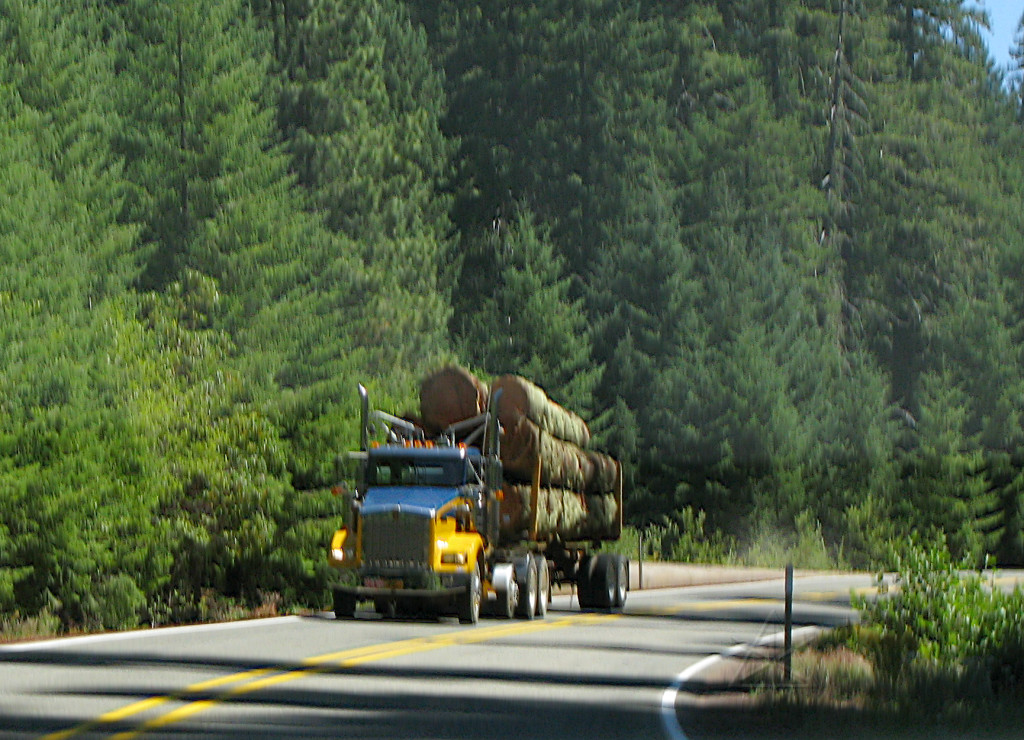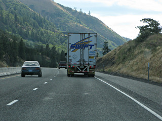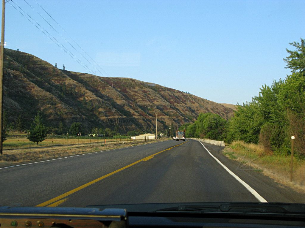 | My "swift boat" carried me for the next three hours, all the way to Portland. If I was getting any distant wind shielding effect from the trailer at all I couldn't tell since as the road bent back and forth the wind came from different directions. Just look at the tree on top of the little rise next to the truck, for instance. The driver could always see me behind at a safe distance and I was sort of doing rear-guard action for him by keeping other cars off his tail. He probably wondered what the heck I was up to since this was probably very atypical behavior from a 4-wheeler, or maybe he didn't even notice. But between keeping that spacing and tracking his minor slowdowns on the hills, ridge-riding, deflecting traffic from the rear and continuing to fight the cross-gusts, it all took quite a bit of my attention. | |