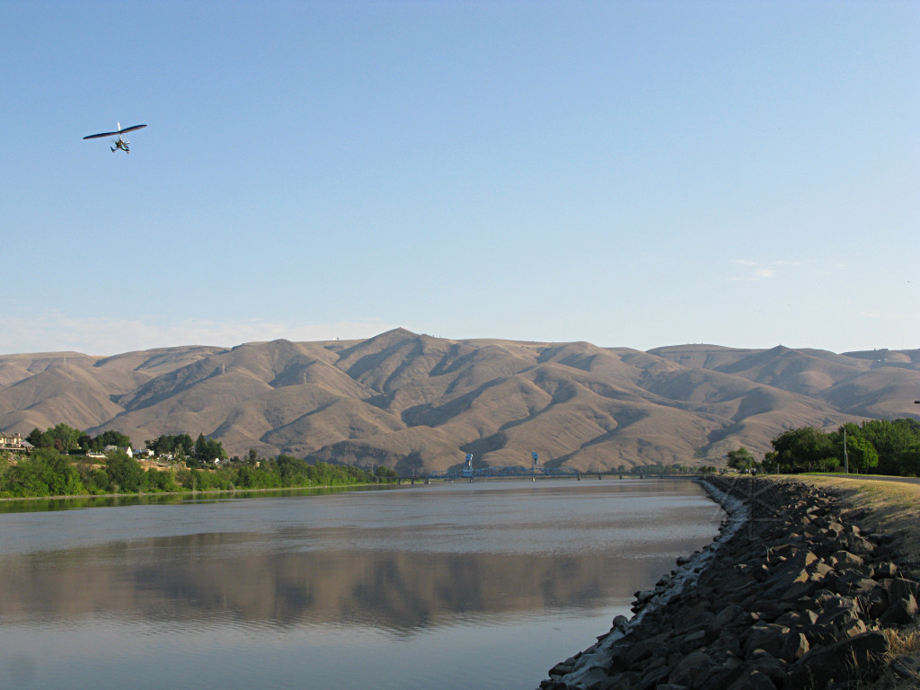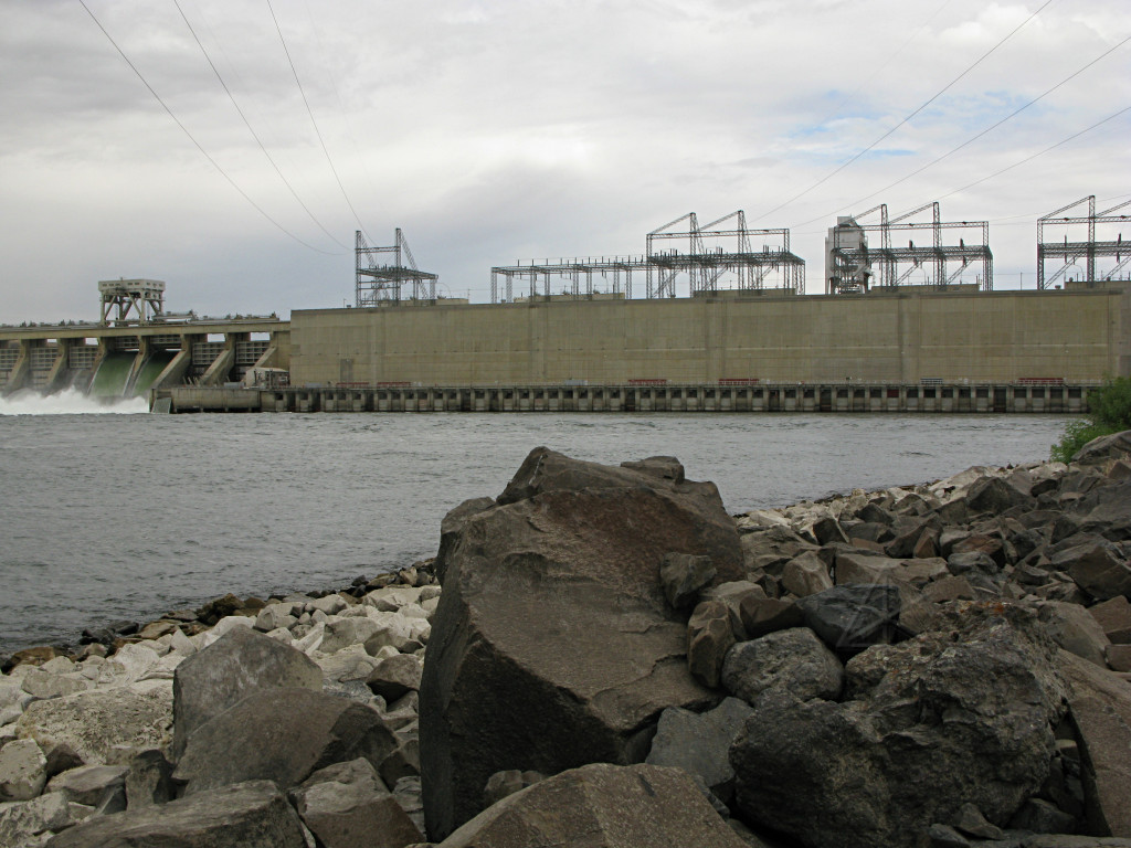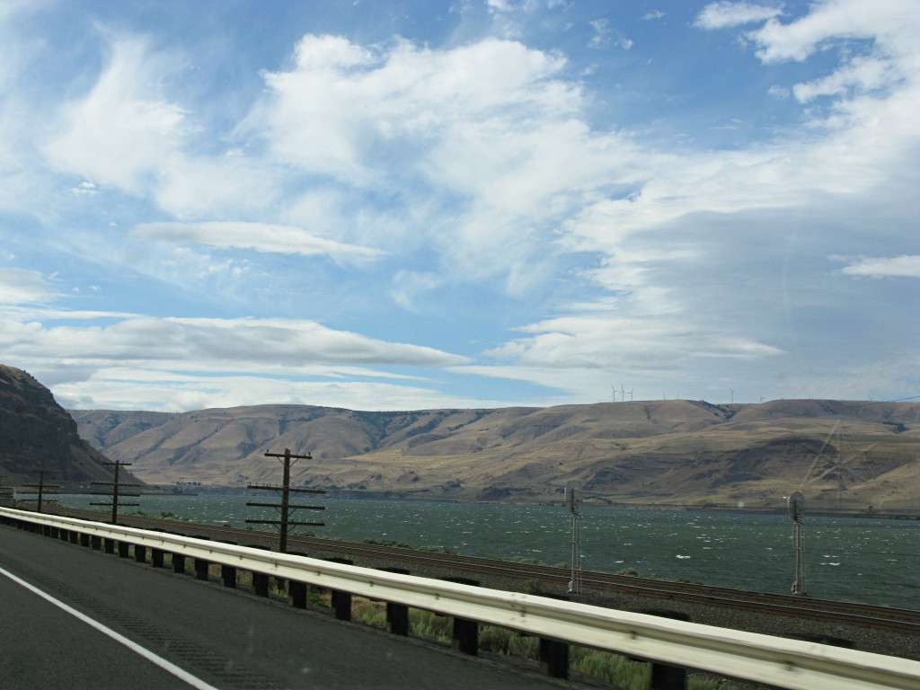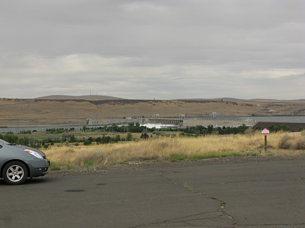 It's mostly about hydro power -- not a particularly high head and no intentional lake behind it, but definitely a lot of water volume and power available. This is only one of five or six such hydro dams down the length of the Columbia. Clearly, Washington and Oregon have had a significant clue about renewable energy for a while now. What I find rather astonishing is that I was only at 385 feet elevation at this point, and that the river only has that much head to flow all the rest of the way across the state to reach sea level, about 260 miles from there, *and* supply a few more hydro dams' worth of power. That's like a 1:3500 rise over run, and a real eye-opener as to just how little pitch it takes to make water flow a long distance, and somehow it stays for the most part within its banks the whole way. Then again, crossing the Mississippi at 800 feet and considering how far that water would continue to flow presents a similar picture, but I didn't think about it back then. | |