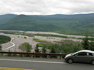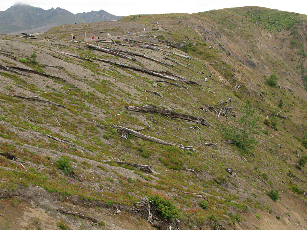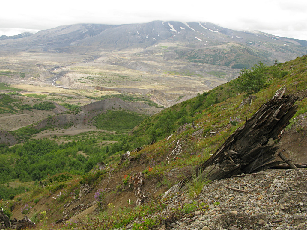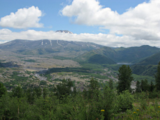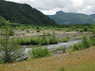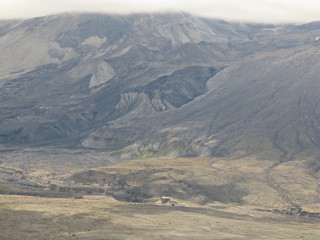 Fairly soon the valley below the volcano came into view, full of the mud flow from the eruption. Some growth has started here and there on it, but for the most part it's still barren. |