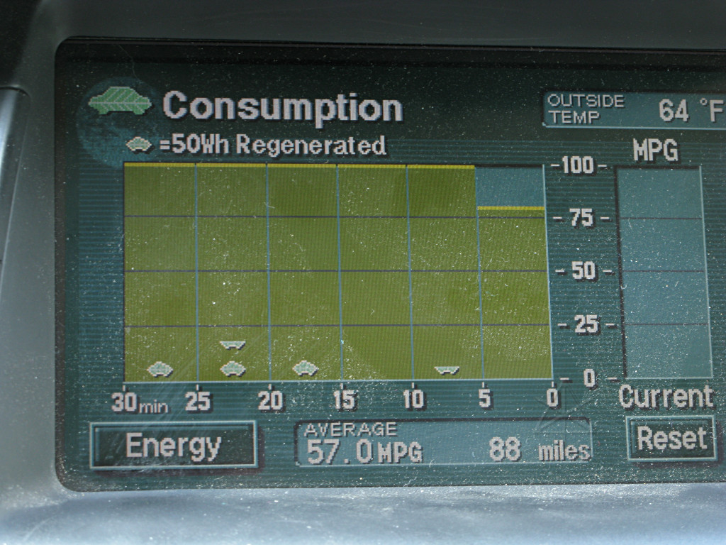 I pulled into the same gas station I had tanked up at earlier, and this pretty clearly shows the last part of the downhill run. I started at 460 feet and ascended to 4200 and back down, clearly way outside the limits of what the regen braking can deal with which is about 600 vertical feet at best and on the way down, there was a good amount of B-mode going on to help bleed off extra energy. But it wasn't all one big hill; there were various stages of up and down and opportunities for a little more subtle state-of-charge management, and overall I didn't do too badly here. |