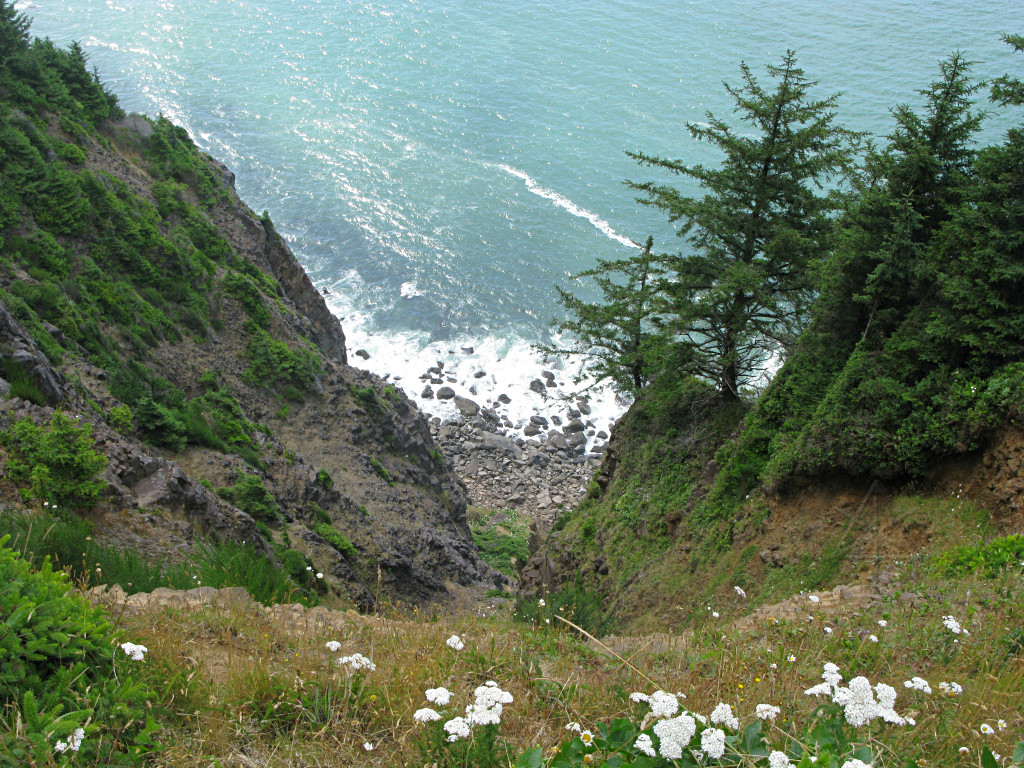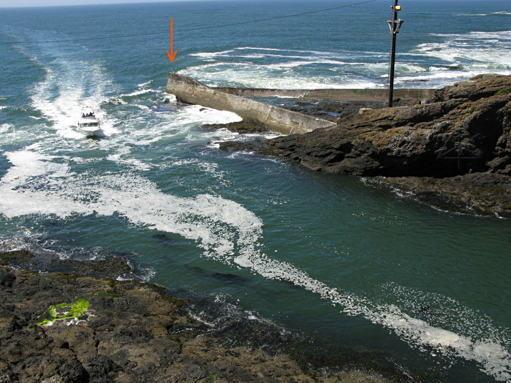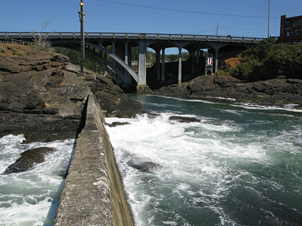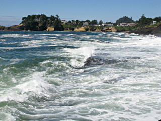 At one of the pull-offs, a local expressed interest in the car and my being all the way out there from Boston and we got to chatting, and while on the subject of the coastline's rugged beauty he mentioned that I should stop and see Depoe Bay which claims to have the world's smallest and one of the best-protected boat harbors. A little later I found myself in the middle of said town, and just across the bridge pulled into a convenient parking spot to get out and wander a little. |
