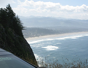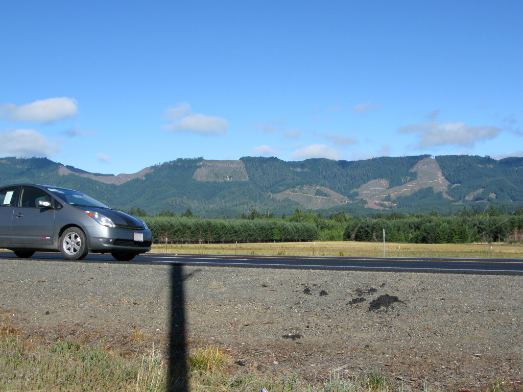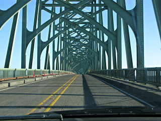 | The haul through this stretch was made additionally arduous by the fact that the pavement was rather rough. But I found that if I hung toward the right of the lane just out of the "truck ruts", the ride was a bit smoother. This is unusual, since it's usually the other way around with the flattest pavement down where countless tires have rolled over it. With my MPG average rapidly heading south, I gave up on trying to push any harder against the wind and road and figured it was just going to be a long grind into Portland. And of course most of the other traffic was flying by in the left lane, completely oblivious to how much energy was being expended in the process. |