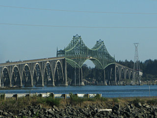 Farther down the coast I came to Coos Bay and crossed over its graceful cantilever bridge, which immediately so appealed to me in an artistic way that I managed to snag this picture from the approach road. |