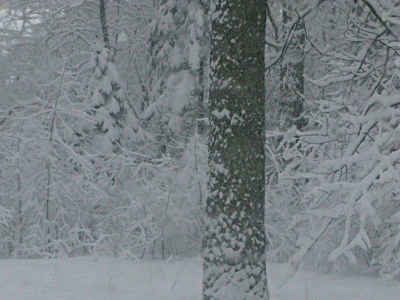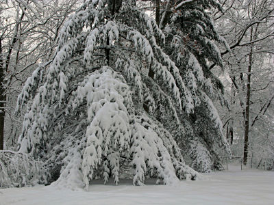 | A little later I set aside working on Arisia stuff and went outside. The temp was just around freezing and apparently the snow was being very clingy as a result, piling up on everything with no wind to knock it off. |
