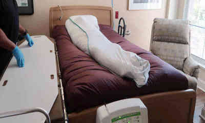 cranked up to its maximum height, he wrapped Mom up in whatever sheets were