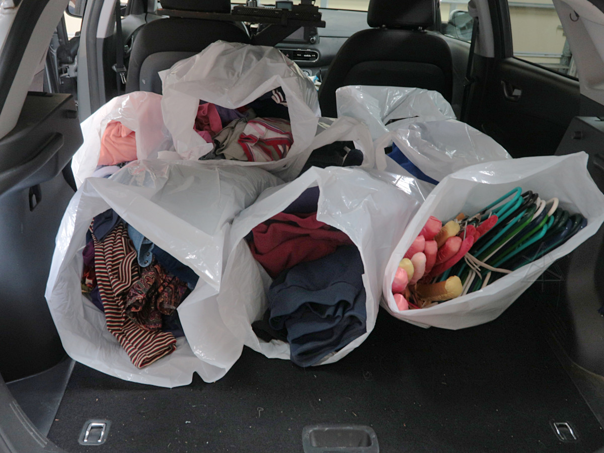 clothing and shoes into the car, along with the 50+ hangers that must have
