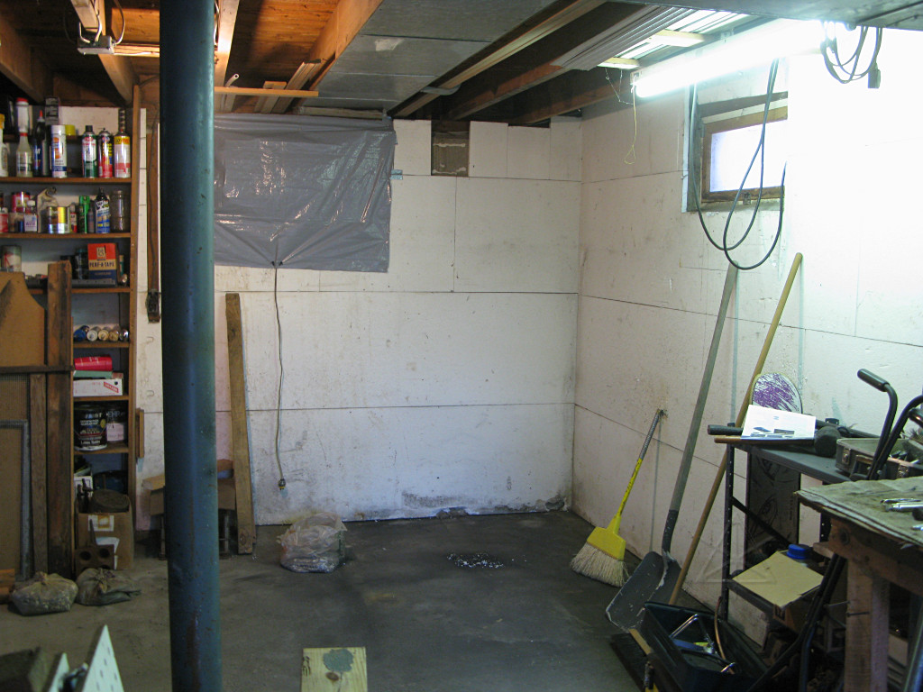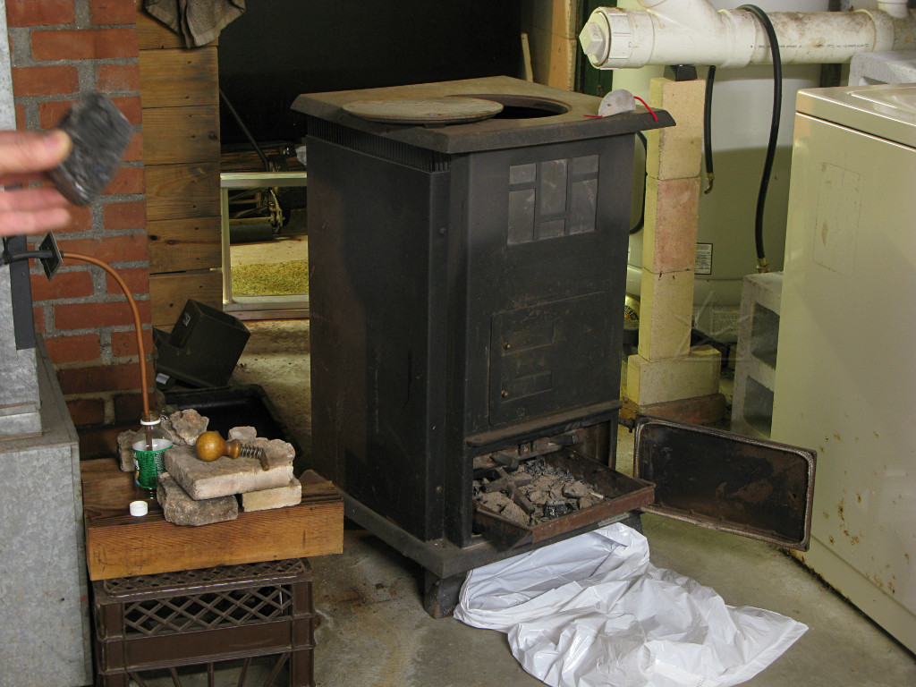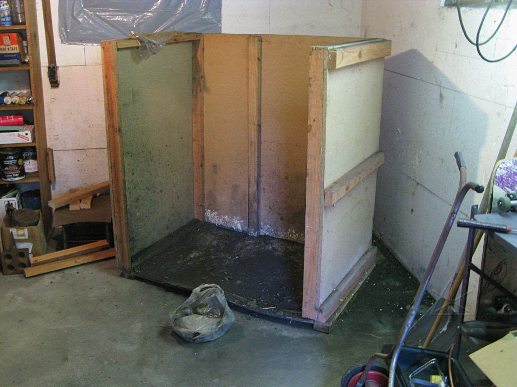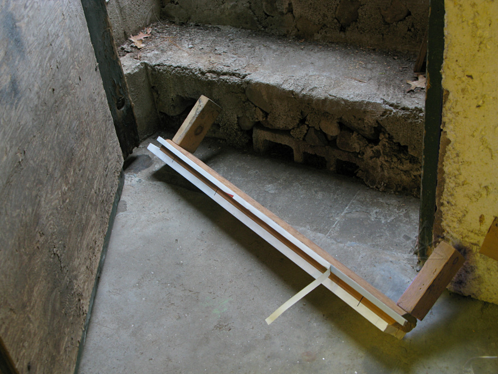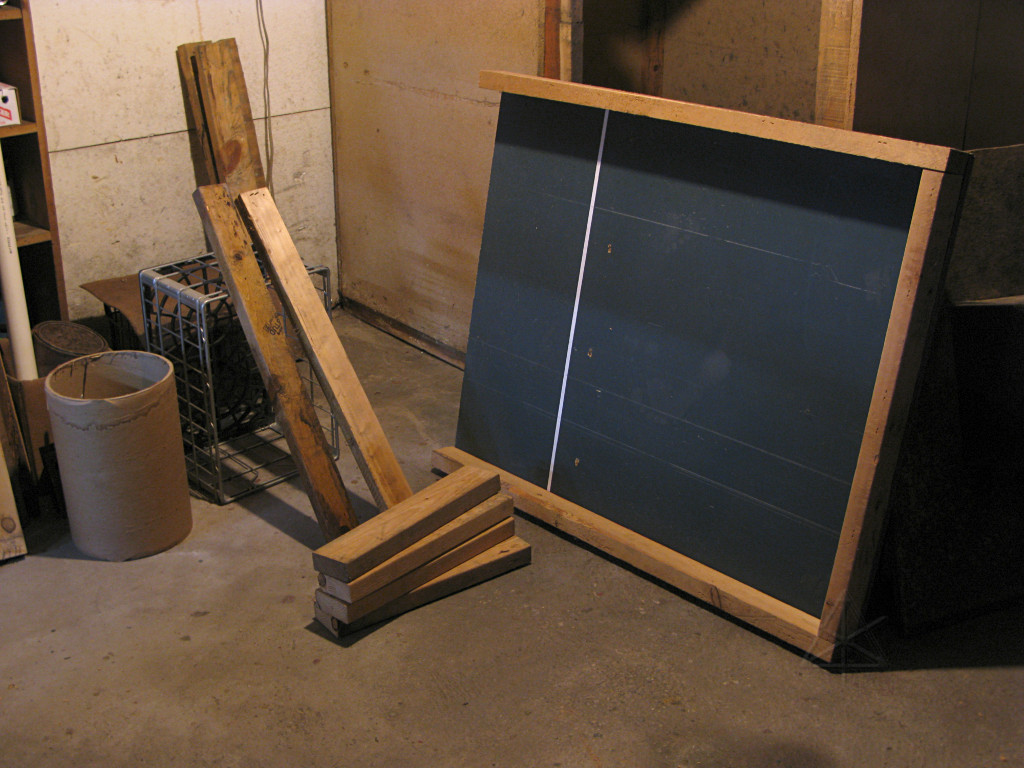 I thought of constructing some sort of low table for the heat-recovery ventilator [HRV] that would eventually arrive, as I didn't want to chain it up to the joists in the typical way they get installed. This piece was about the size I was thinking of and I'd just recovered a small handful of 2x4s of some rather dense wood. They'd make fine legs for something like this. So in the bit of space cleared in front of the coal mess I started throwing together the HRV table, which after the addition of a couple of diagonal braces later worked out perfectly and fit exactly where I ultimately intended it to go. That way any HRV fan vibration would be coupled to the basement slab rather than the floor above, and wouldn't transmit noise into the house structure. |