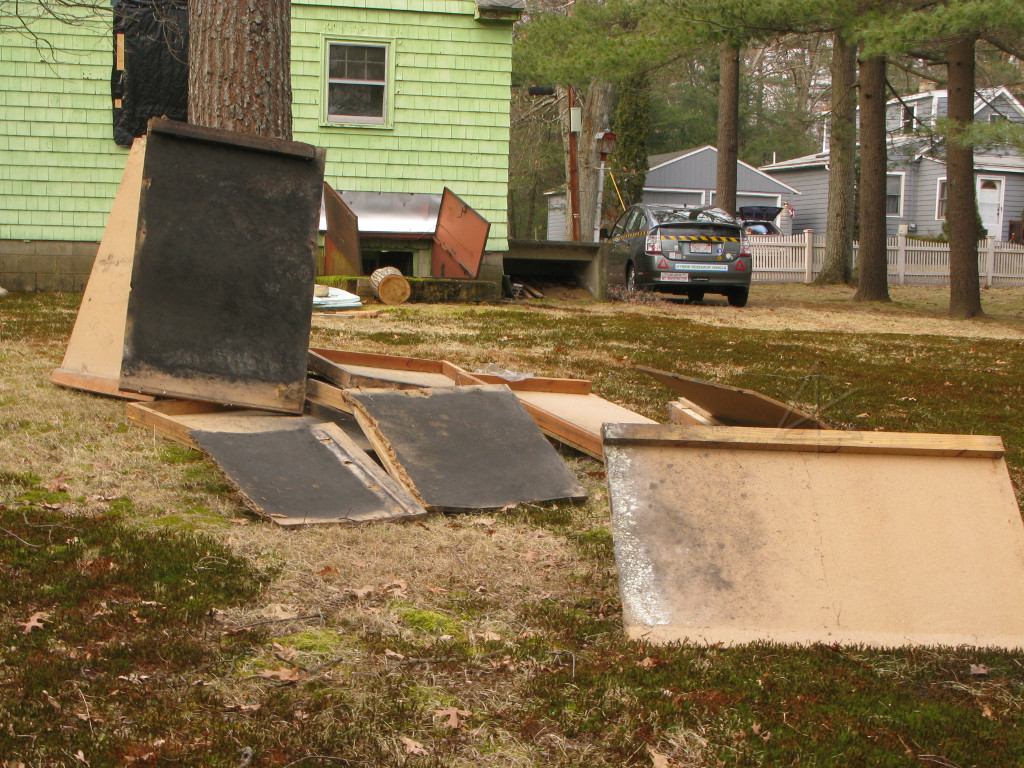 | At this point the green-builder folks and all my research had me pretty convinced -- my decision to seize the re-roof/re-side opportunity and go the energy-retrofit route was becoming clear, even if I wasn't sure about the windows yet. Maybe not as "deep" for me as some of the more extreme studies, but the benefits of doing the external insulation had become quite evident. I began referring to it among friends as wrapping the whole house in a giant foam beer-cooler. In working toward that I had been talking fairly extensively with Synergy and Boston Green Building both of which heartily endorsed the idea; the latter was also a candidate for a while but had to drop out later because they were so overloaded with several of the National Grid program projects. [Or maybe it was because I had too many questions for them, it was kind of hard to tell but they did bail rather suddenly.] Synergy had suggested that I go visit one of their job sites in progress to get an idea of what happens during these things, which I thought was an excellent idea; you can only get just so much info from pictures in case-study PDFs and it would be nice to see the real thing. |