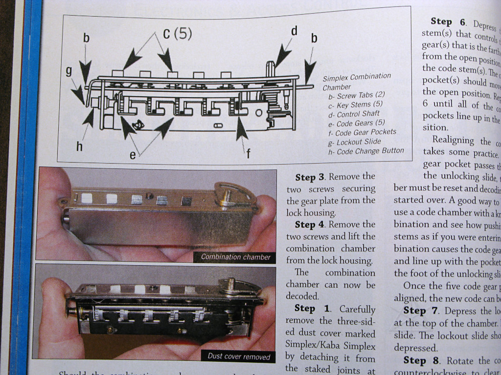 What's especially ironic about me having one of these locks on my door is that *way* back in the day I wrote one of the seminal text-files [backup copy here] on how to manipulate them open using differential pressure techniques. It even works if the lock has been programmed with the special "mil-spec" trick that requires holding a button halfway in during the open cycle. Simplex didn't tell everyone about setting combinations like that, but it's pretty obvious once you start studying the rather cleverly designed innards. Here's part of an article on them from Locksmith Ledger. |