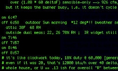 I also discovered that the residential HVAC industry is plagued by a lot of guesswork and flat-out bullshit, particularly where setting up and tuning a system is concerned. A lot of "technicians" don't even understand how the refrigeration cycle works, they just know a couple of numbers they need to see on some test gear and if the evaporator gets "beer-can cold" then they're packed up and in the truck and heading to the next job. The science of filling a system with the right amount of refrigerant is imprecise at best when half the required conditions for measurement are ignored, and the pictures and videos of improper duct installation are numerous. Personal accountability is generally evaded and the consumers are left pick up the cost of that careless laxity with poorly-operating systems and higher energy costs. Well, maybe it's not all that bad but there's no doubt that certain levels of misunderstanding exist even on successful installations and repairs. I found one or two really bright spots in this otherwise somewhat gloomy picture, such as UDarrell's HVAC stuff, which is a little confusingly enthusiastic in its style but packed with good clue and tons of references and war-stories. HVAC can be non-intuitive at times and many of its field workers do things by rote without completely understanding what's happening inside. Fortunately, the newer super-efficient systems have eliminated a lot of the guesswork with better sensor feedback and computer control -- subcooling and superheat, ambient temps, capacity turndown, variable airflow, all automatically handled -- some of them even manage their own refrigerant-filling, simply taking the appropriate measurements and informing the technician when they're done. And some of the blame for poorly-performing systems does rightly rest on the consumer who never remembers to change filters and clean coils and muck out the slime in evaporator pans or do any of the other basic end-user maintenance that A/C and heat pump systems should receive. But at this point in my study I was quite aware of all of that and prepared to deal -- it would still certainly be a task less onerous than scraping oily soot out of the rusty little convolutions inside the furnace. All fine and dandy, but what would my specific needs be? I had two major sources of data to work with, both of which would be viewed with skepticism by the guys over at the HVAC-talk forum. One was the fact that my little 5,000 BTU air conditioner for the basement could keep things quite a bit drier both down there and to a surprising extent in the rest of the house. The other was the burn rate on the oil furnace, whose efficiency I soon determined to be on the order of 60-something percent in terms of heat delivered vs. amount of oil consumed. Now, the by-the-book way to do load calculations is through a thing called Manual J. A few years ago a bright HVAC engineer named Hank Rutkowski got tired enough of seeing all the different ways that installers would take guesses at needed capacity and get it wrong so often, that he decided to try and codify it across the industry. By trying to pull in *all* the possible factors affecting a residential building -- climate zone and degree-days, insulation, window types and which way they face, roof and siding colors, shading, square feet, where the equipment gets located, number of occupants and their behavior, appliances, pets, plants, and everything else -- he came up with an inordinately complex method to go room-by-room and add up all the anticipated loads for both heating and cooling. But evidently those who ground their way through the process were pleased enough with the results that it was adopted as gospel by the industry. By the time Manual J reached its eighth edition nobody did any of this by hand anymore as there are any number of computer programs to plunk numbers into, but even with these tools there's still a lot that the human driving them can get wrong. How, for example, does anyone determine the *net* insulative value of a wall *assembly* after thermal bridging, hidden construction shoddiness, and largely unknowable parameters for various components are taken into account? Simple: you can't. While a formal load calculation can certainly help ballpark what to expect, especially in well-managed new construction where routine inspections can keep things reasonably uniform, it is not the be-all and end-all answer to how many tons you need. Real life is not that kind. Unfortunately the industry has clung tightly to the idea and I read rhetoric from several high-horse purists who try to maintain that an HVAC tech who does *not* jump through the hoops of the various ACCA Manuals is some sort of lowlife who doesn't deserve to be making a living at the trade.