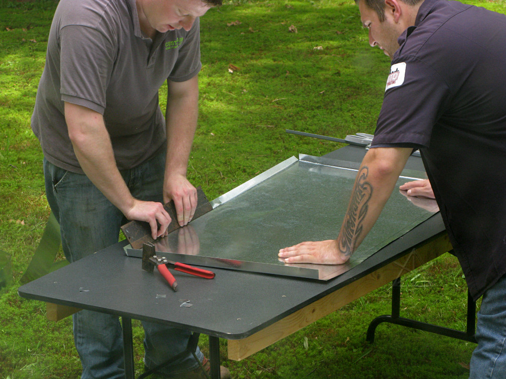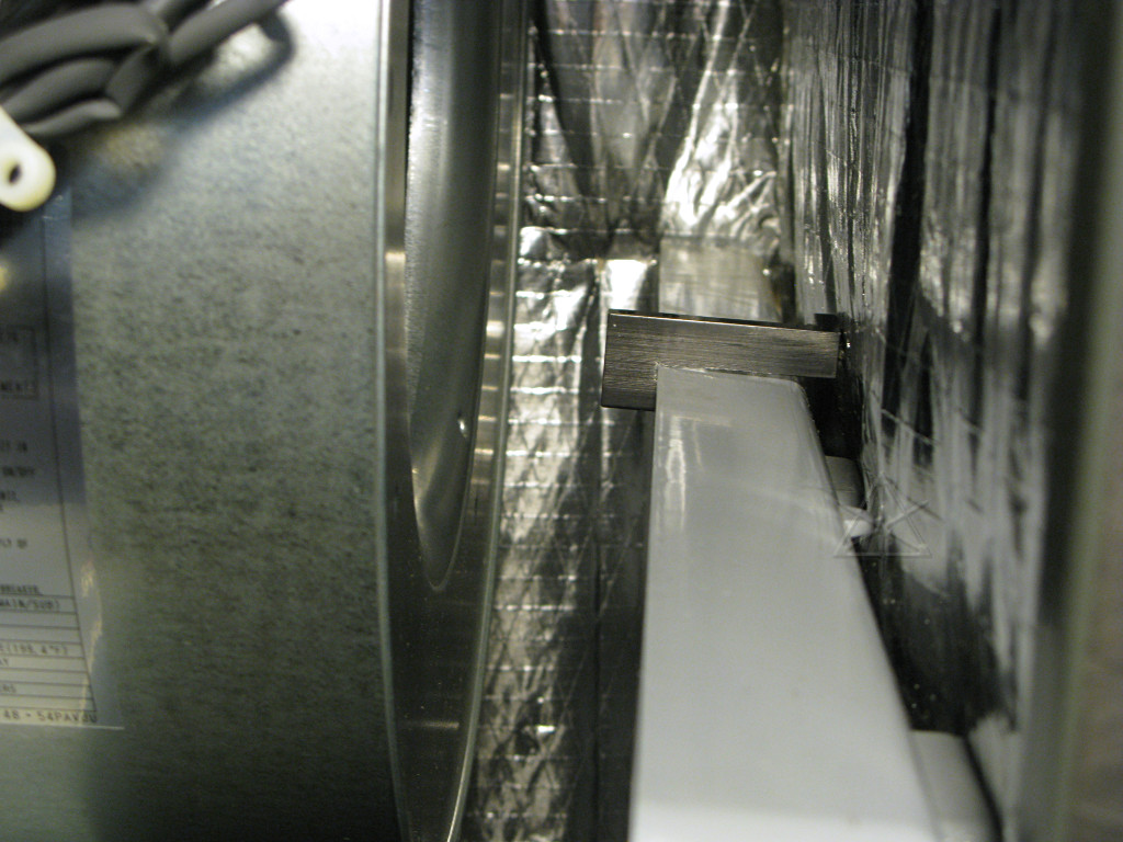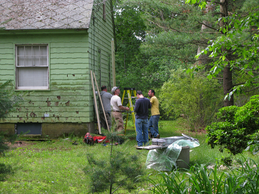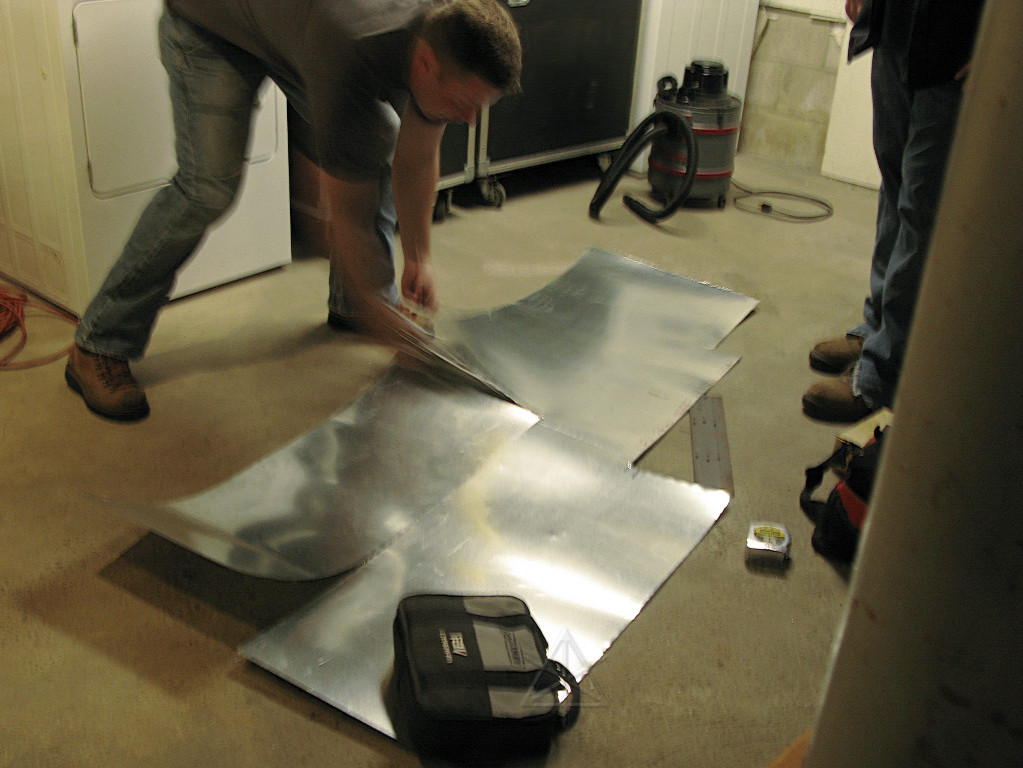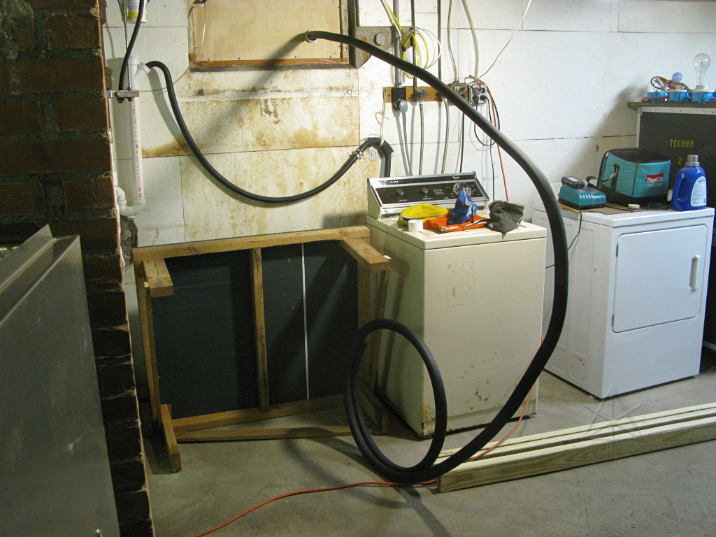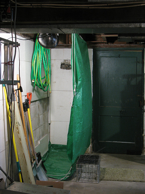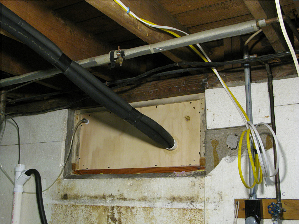 One simple idea came while putting some of the ductwork back together: I realized that simply keeping an end cap off one end of the return system would cause the air-handler to pull primarily from the basement, thus supplying already-cooler air that would probably need a bit of drying anyway. I flattened the locking tabs and added a pair of nice handles, making it an officially removable piece and a beautiful solution to the basement circulation and drying problem. Well, once I had an air handler again. With a supply register for the basement area already present at the other end, it would allow for nice circulation of conditioned air down there in addition to upstairs. It was a passable theory, anyway, as I looked at the completely disconnected duct ends hanging over the furnace pad without any good way to push any air through them. Fortunately the weather was generally nice and I could pull a little fresh air through the place using the front door stormdoor and the like ONE openable screened window I had left. The hack dehumidifier kept the basement under reasonable control in the meantime, but I could tell that the warm-weather humidity was already trying to seep in. |
