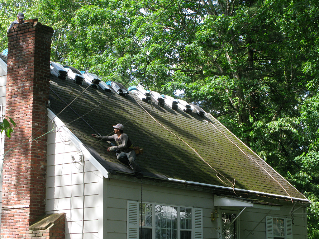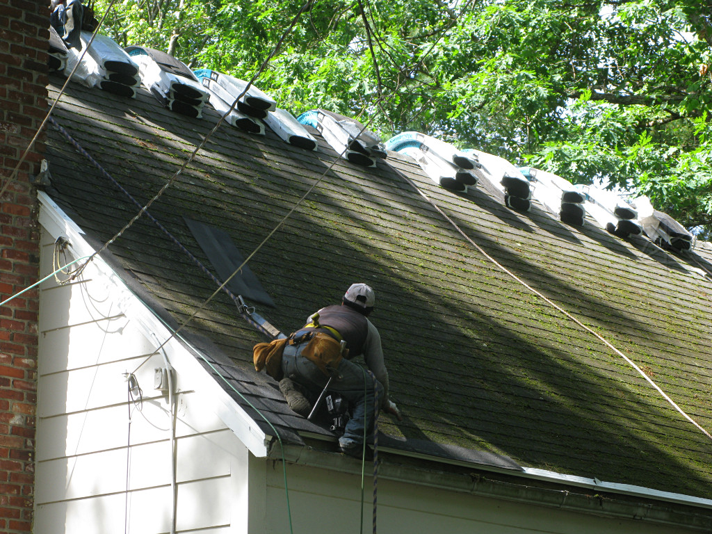 The following week brought a re-roof job next door, where my neighbor had finally decided to do something about his crumbling moss-covered shingles but in the cheapest possible fashion. Five or six guys showed up, none of which spoke a word of english, and they were done and out of there by 2 PM. They did a second layer of shingles without stripping the existing one, and while they dabbed at the moss on the front in a token fashion with a rake and knocked off the worst of it, the rest is still under there. They also did the typical deployment no-no of "breaking the back" of the shingle bundles across the ridge, as advised against in various manufacturer references (pdf). Fortunately it was warm enough and these shingles were cheapass thin stock that the mistreatment probably didn't crack them. And yes, this is done by low-budget roofers all the time but doesn't make it right. |