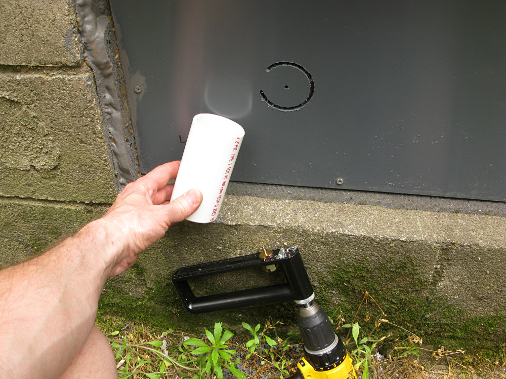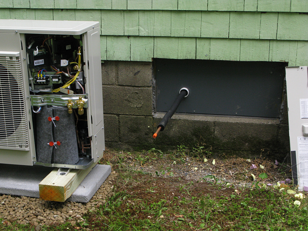 | They fed a bit of the larger refrigerant piping through from the inside, extending enough for a nice S-bend to get into the unit. | |
