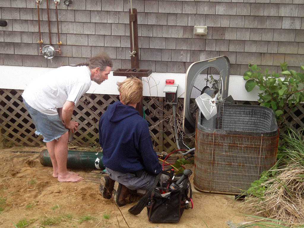| I managed to get away from all this stuff for a while at an annual weekend gathering down on the Cape. I headed down early before some weather was scheduled to roll in and did a bit of biking on the Cape Cod rail trail. The perfect, calm and cool afternoon faded into increasing winds through the evening, and by morning the shoreline was getting blasted by wind-whipped rain that came and went throughout the day. Since we were more or less trapped inside and I was still obsessed with my new study topic, I went exploring the air-handler in the meeting facility's attic and the tankless water heater in the closet downstairs and some little Sanyo mini-split compressor units next door. | |