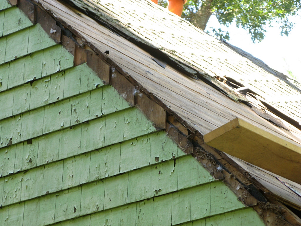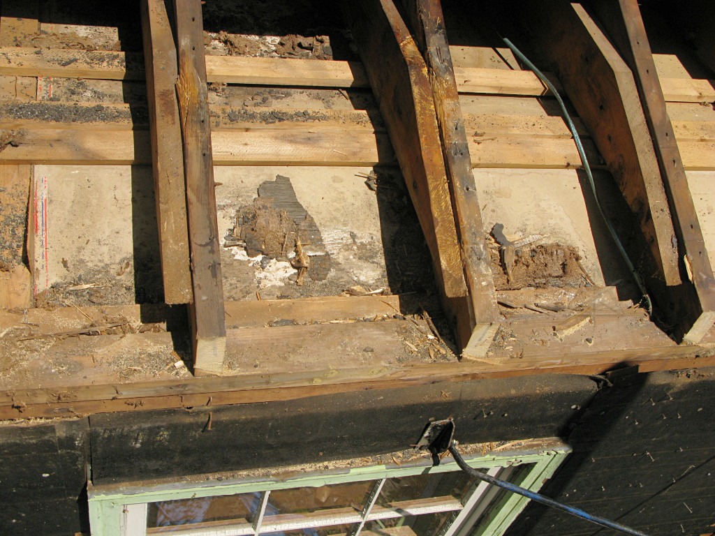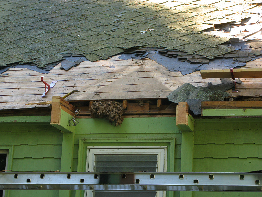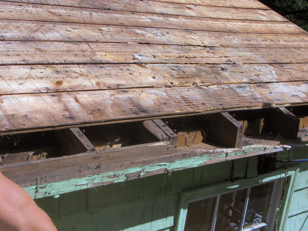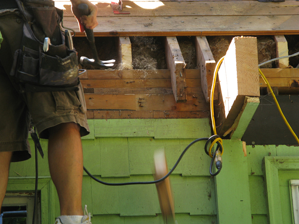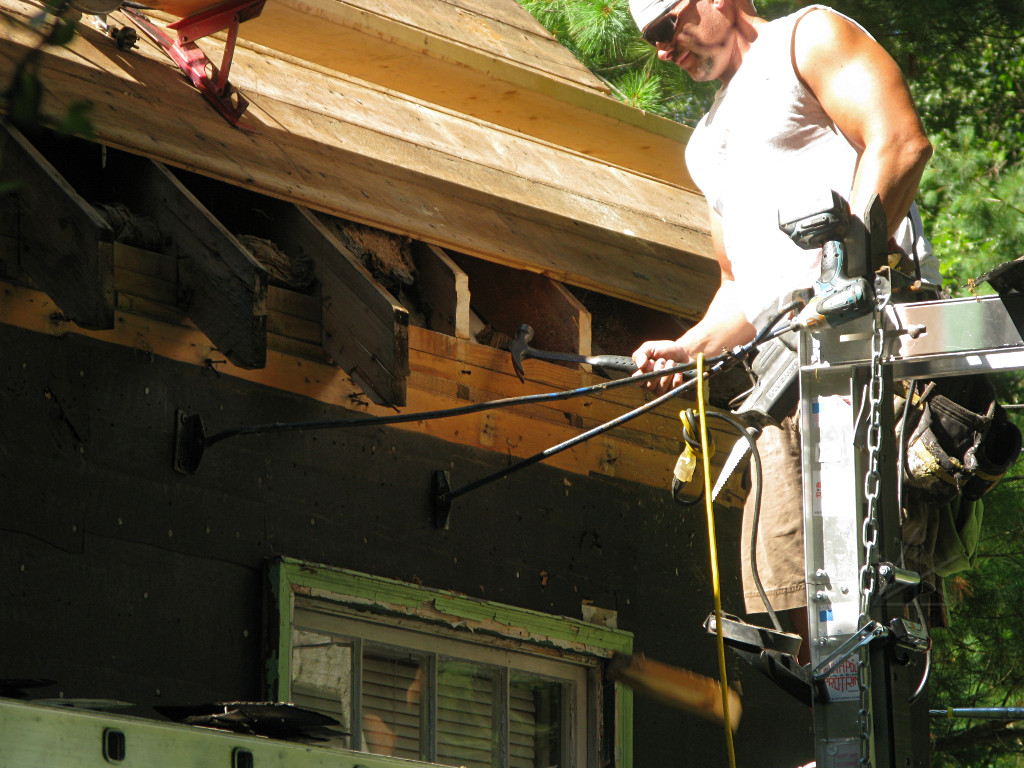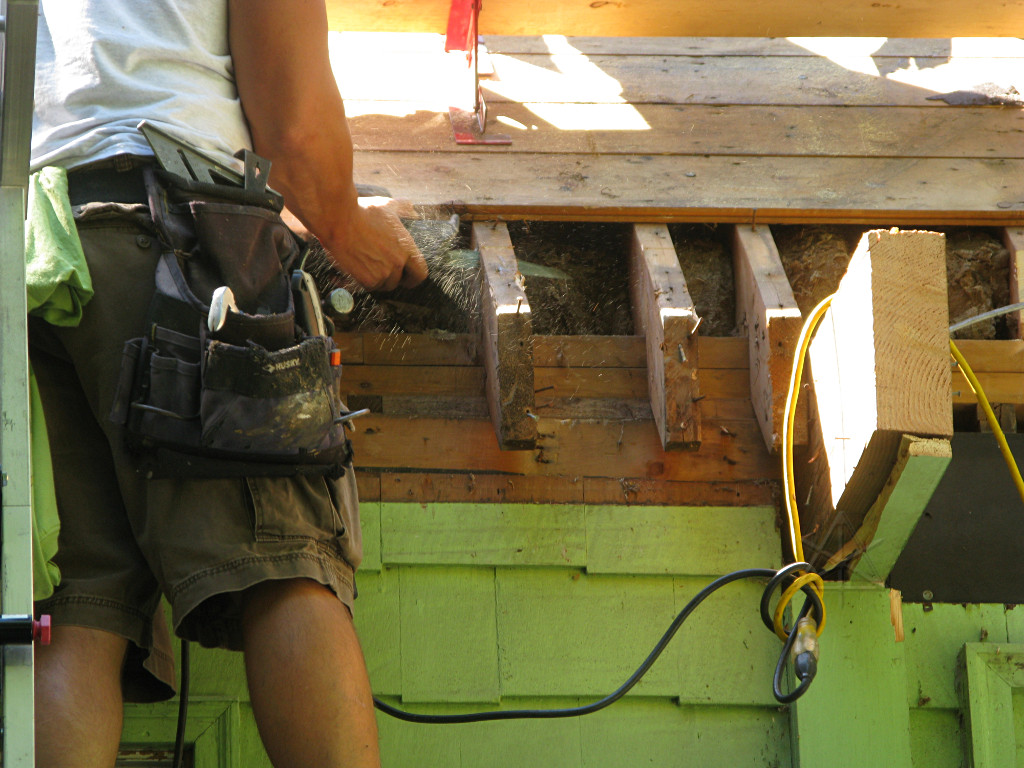 As soon as the front was clear enough with the lowest courses of sheathing taken off, the "chainsaw retrofit" could begin. Only here it was done with a sawzall. This would conveniently take away even more decayed wood in the discarded rafter ends. |
