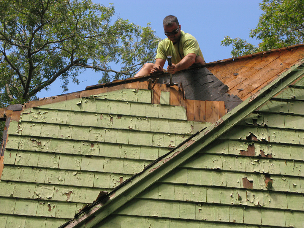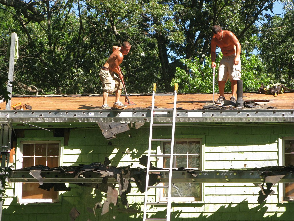 And drop they did. They spent a couple of hours shoveling shingles off the edge onto the tarps below, and pulling up large chunks of stuck-together assembly where it could easily be pried loose ... |