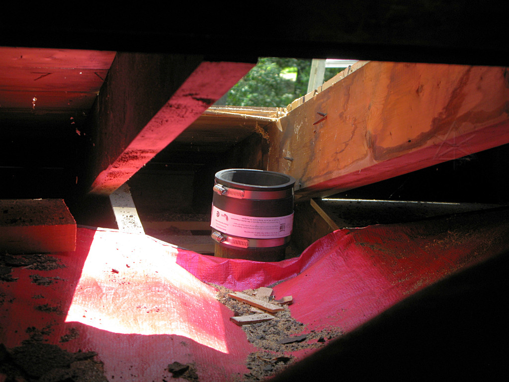 The toilet-stack hole had to get enlarged a little later, so they could get a cutter in and chop off the cast-iron pipe and transition it to PVC before exiting the roof. First noted in part 01, this was my idea but based on numerous references I'd found about condensation resistance -- a metal pipe sticking through the roof would transmit cold to the inside and collect moisture that would then drip down the chase, so changing to PVC as low down as practical would remove that thermal bridge. What I didn't get was a look at, let alone a shot of, the tool they used to cut the pipe but it was probably similar to the chain cutter described here. |