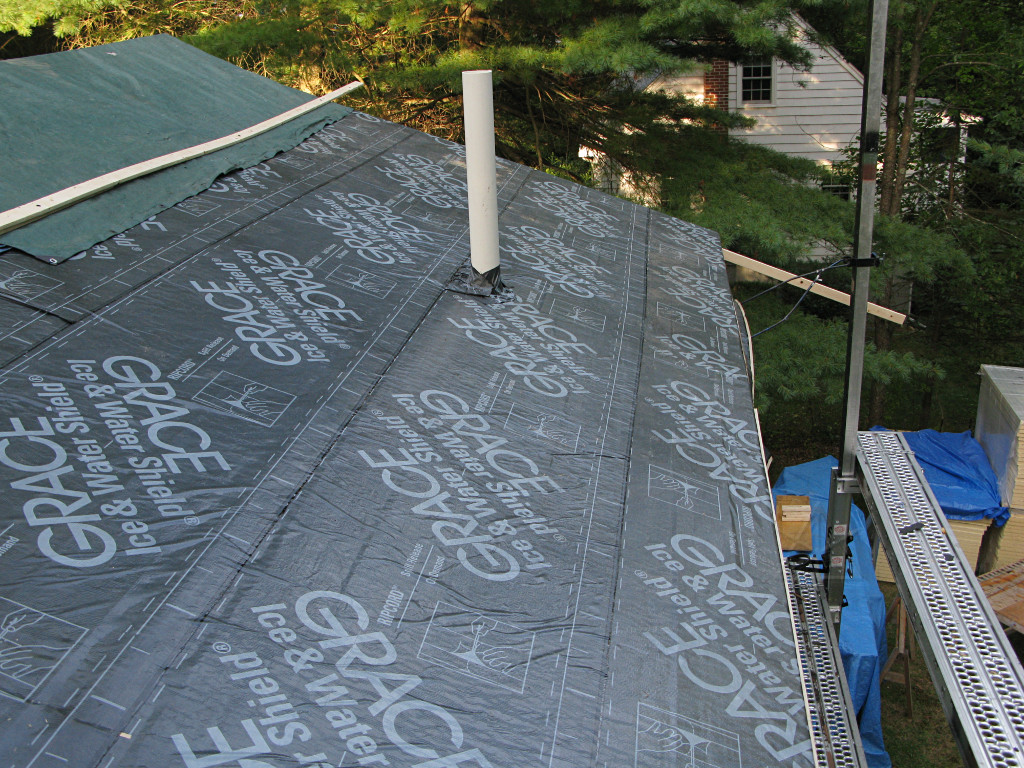 The back deck needed the same Grace treatment, but they needed to pause at the [new, brilliant white!] stink-pipe and make sure it was flashed up correctly with some smaller pieces. |