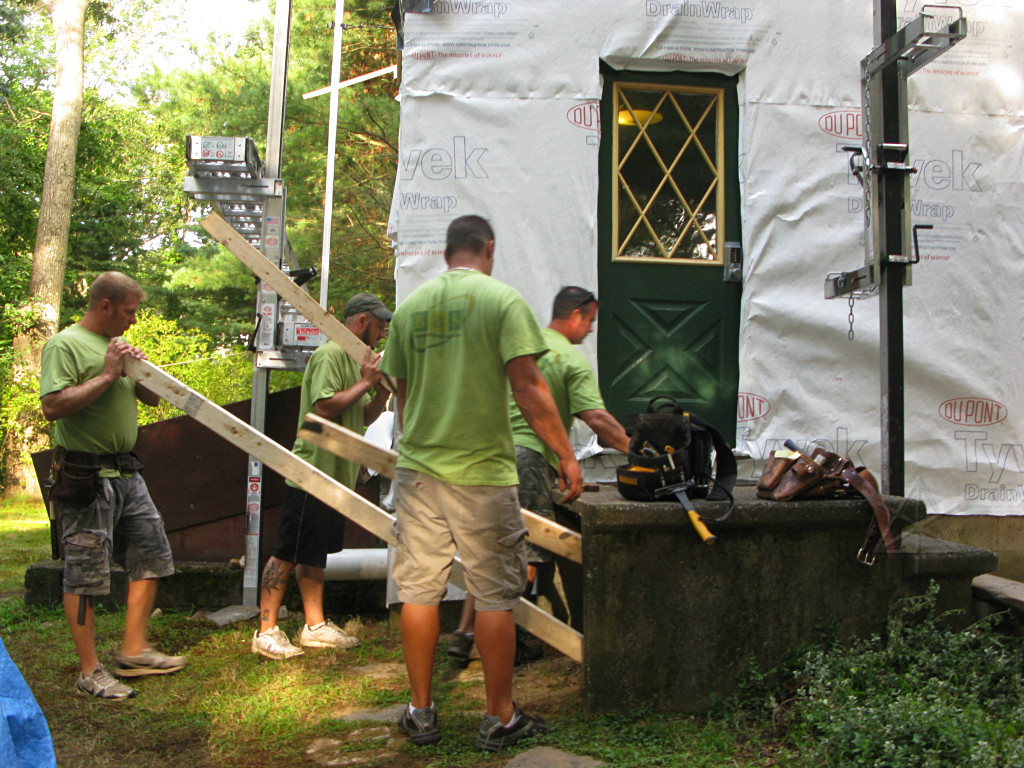 As they worked up to the second story, supplying materials began to involve more of that dynamic aerial art as they tossed stuff up -- such as whole assembled buck pieces. |
