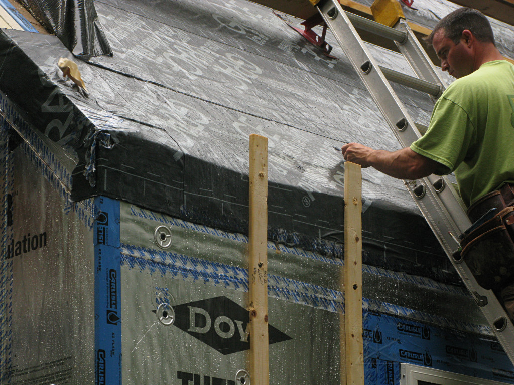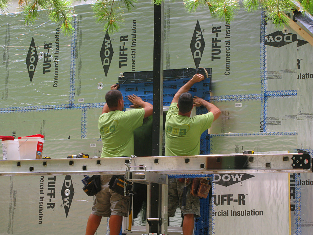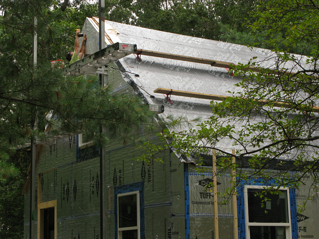 With the windows all installed east and west, the guys were getting near the roof peak. Note how the foam is exactly flush with the roof sheathing, continuing the plane of the wing-wall roofline. |