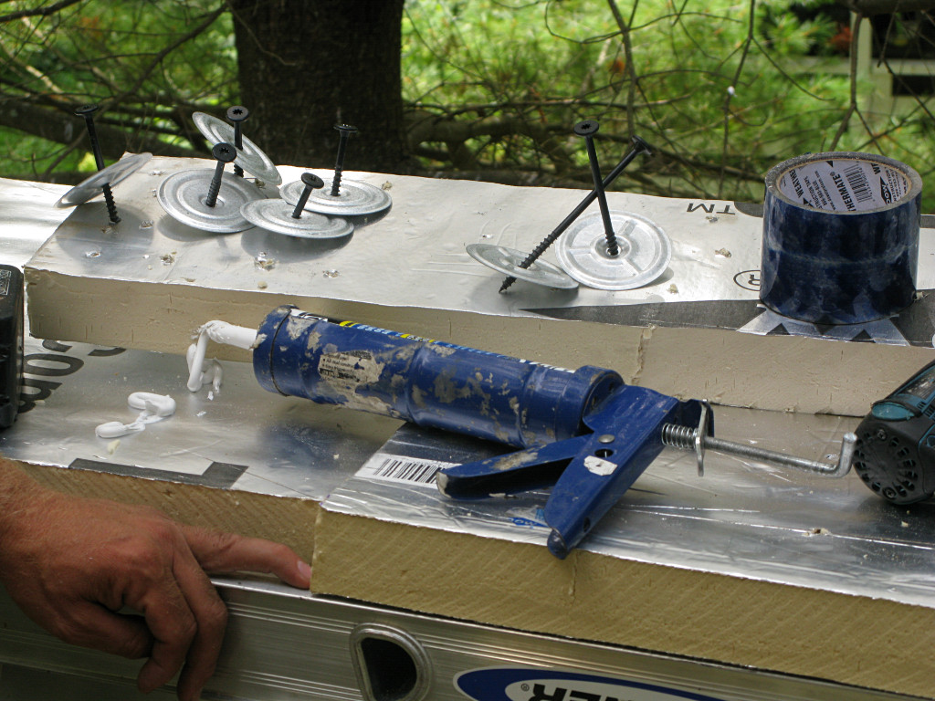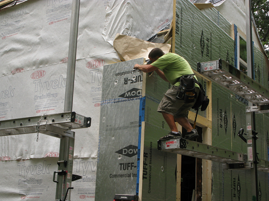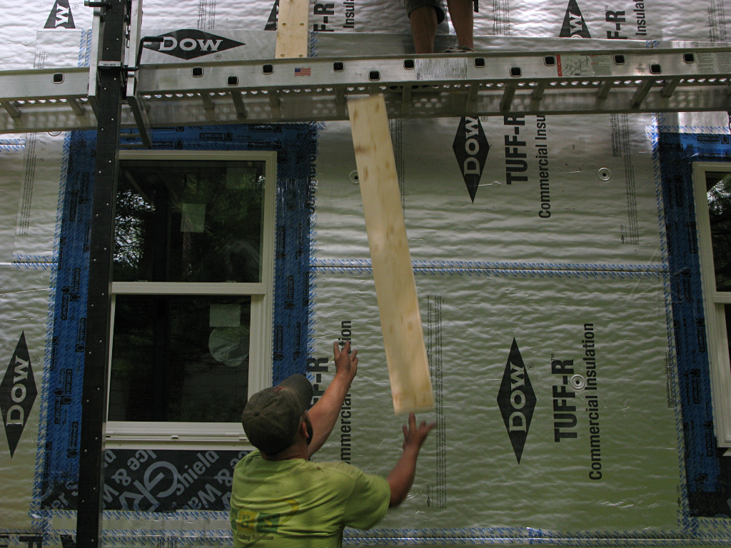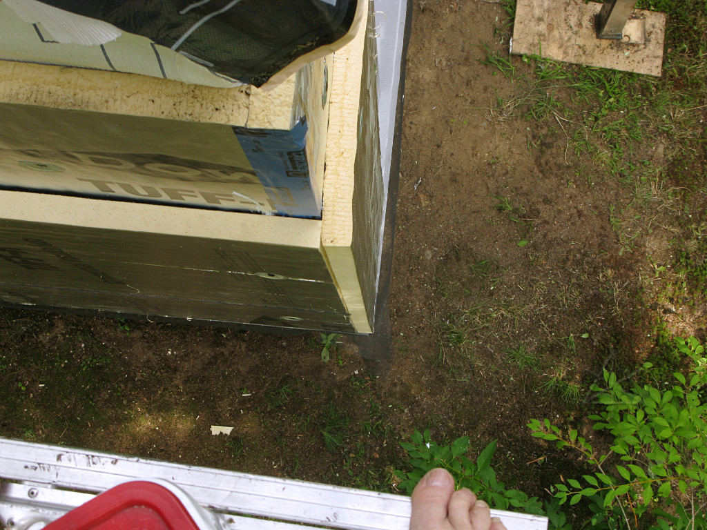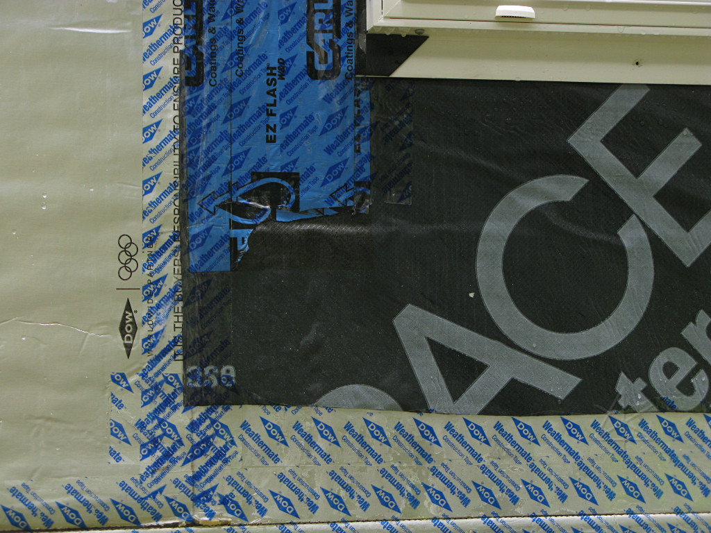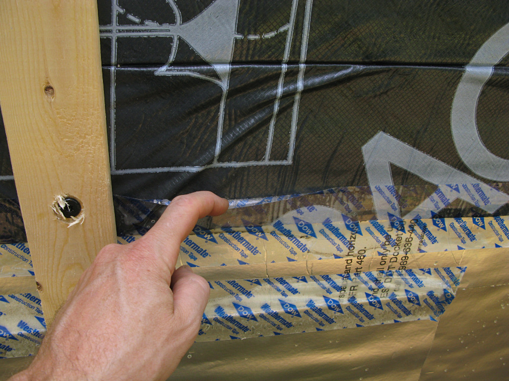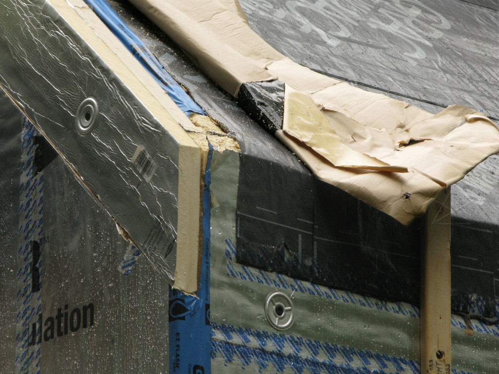 On-the-job training in action. They went around and took care of most of the areas they could easily reach, but not every possible point and it was sort of too late to revisit all of the horizontal tape seams without some undesireable effect on the surrounding materials. You can't just rip this off the foam without taking the foil-face with it. At least one case study I had read recommended using little handheld rubber rollers on construction tape to stick it down really well, but that would have increased the crew's workload even more. We acknowledge that the outer face of the foam *is* the supposedly weatherproof cladding for some number of days during the project, and that due care is needed on these details. Some recent recommendations from Building Science even suggest shifting all horizontal tape applications upward to get more adherent surface area above any breaks in the external plane. | |