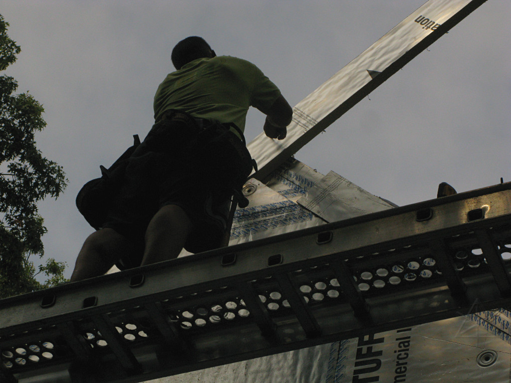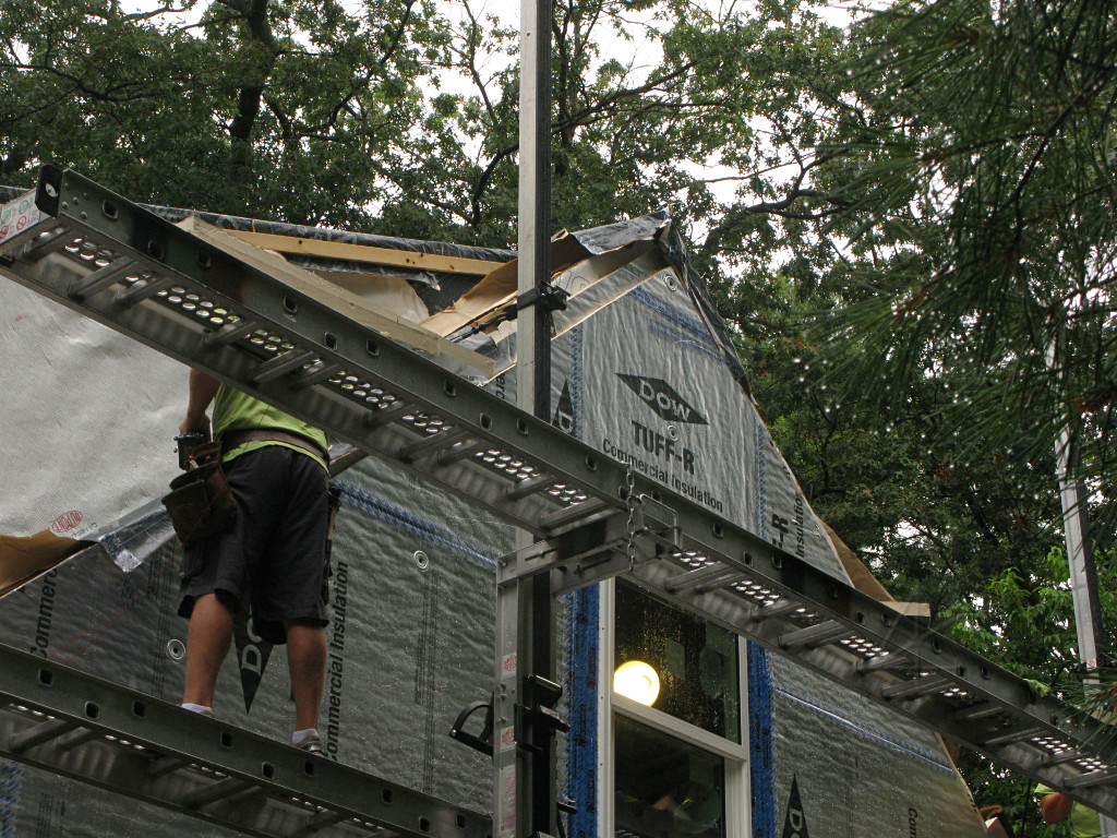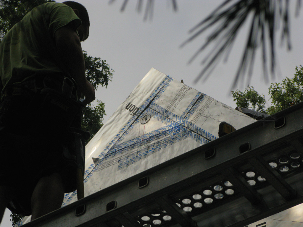 A last triangle went onto the peak, and the Grace got flopped back over everything. There was still a little work left to do here so they didn't seal it down. |