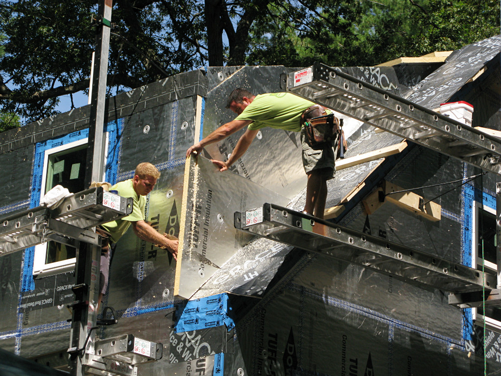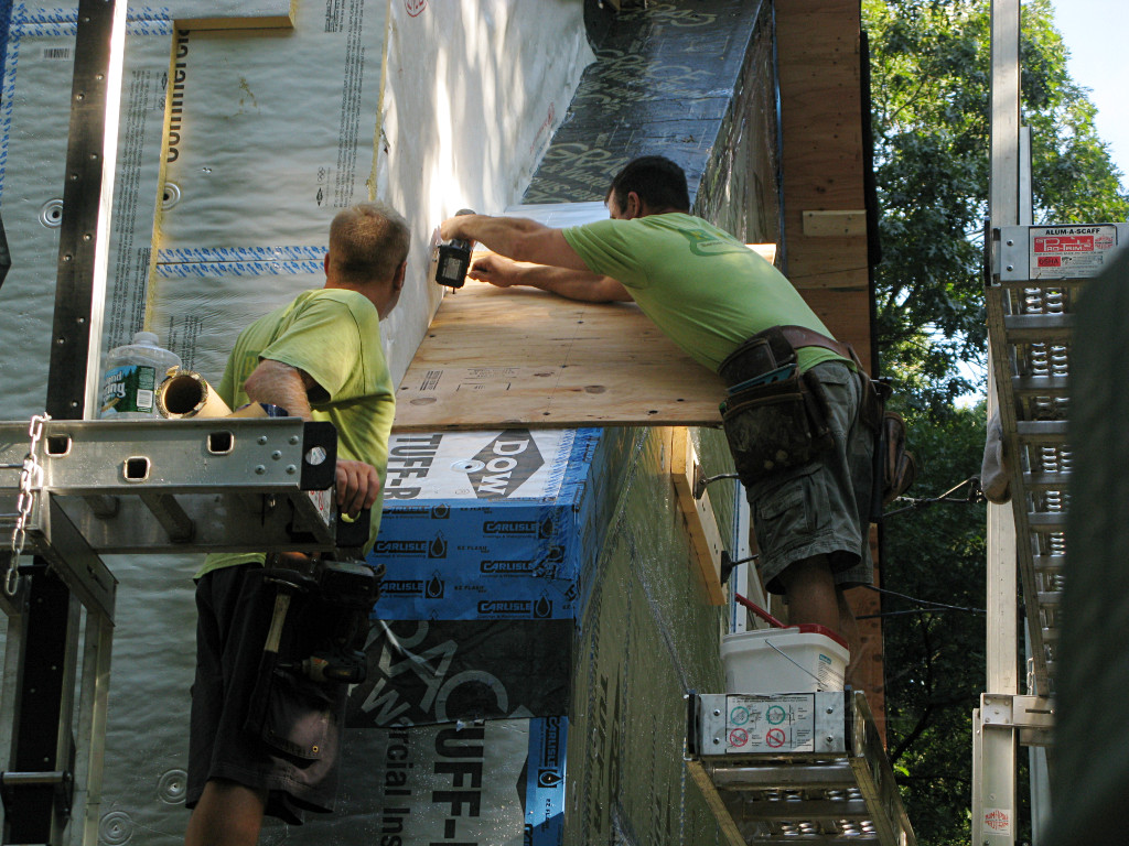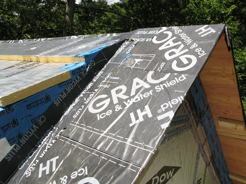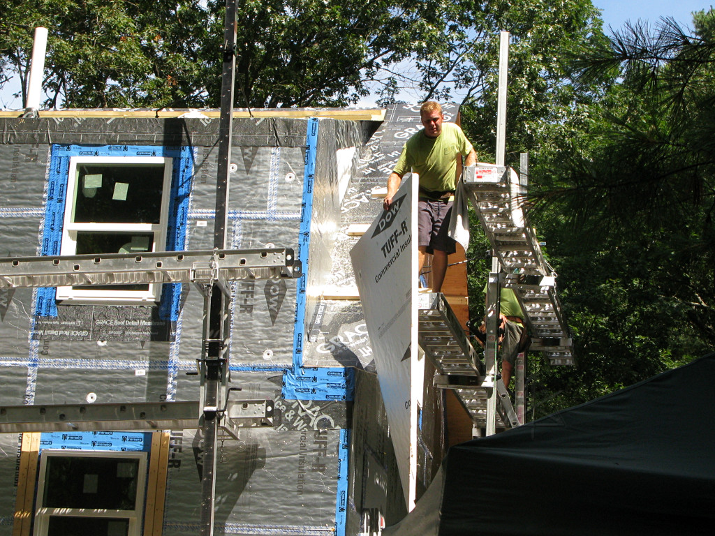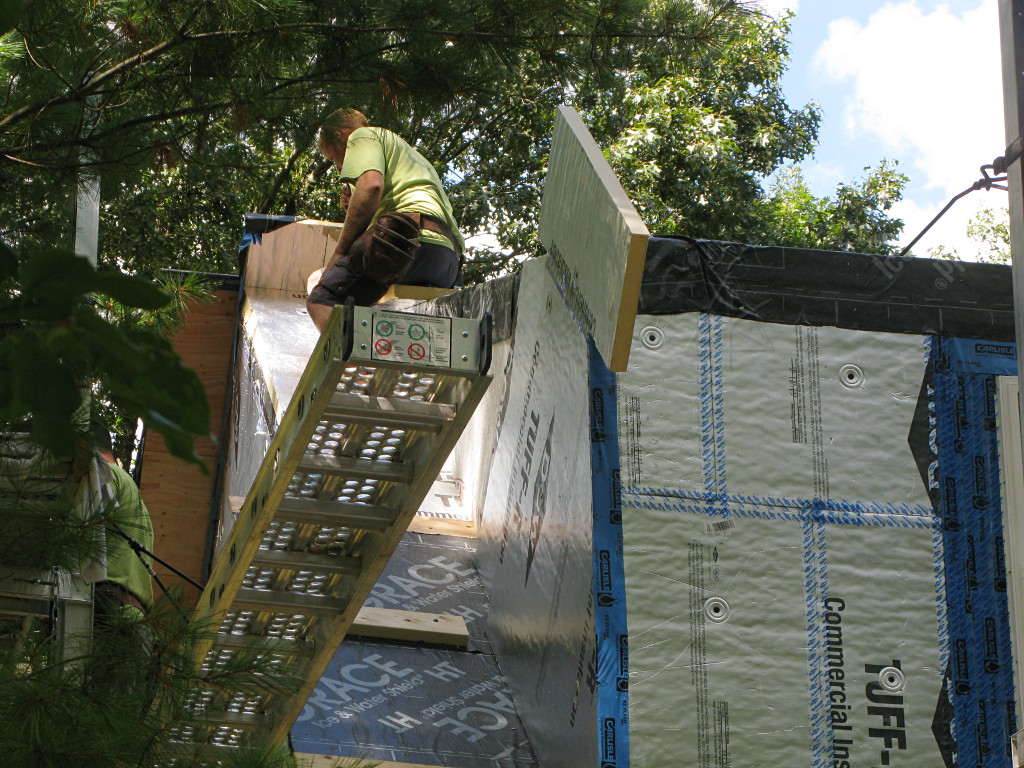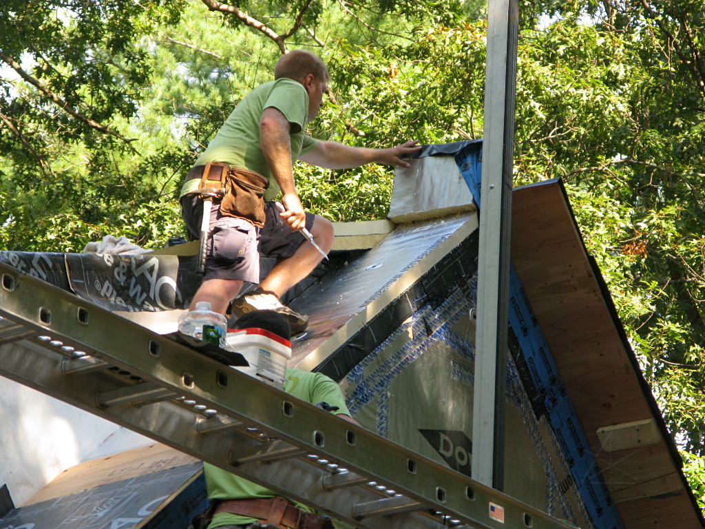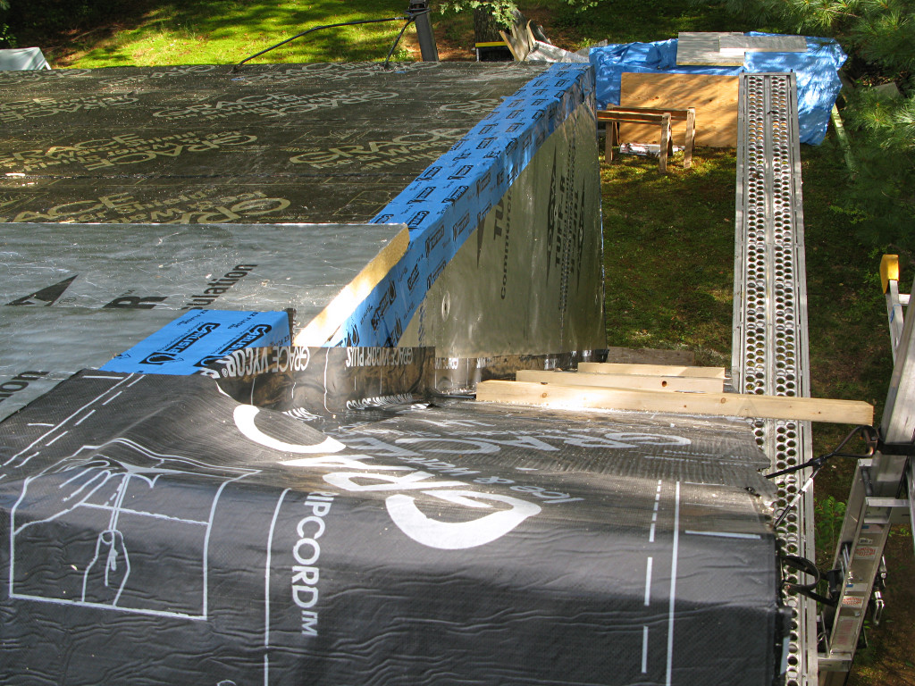 As on the front, the assembly of foam, plywood, and Grace proceeded upward toward the peak. |