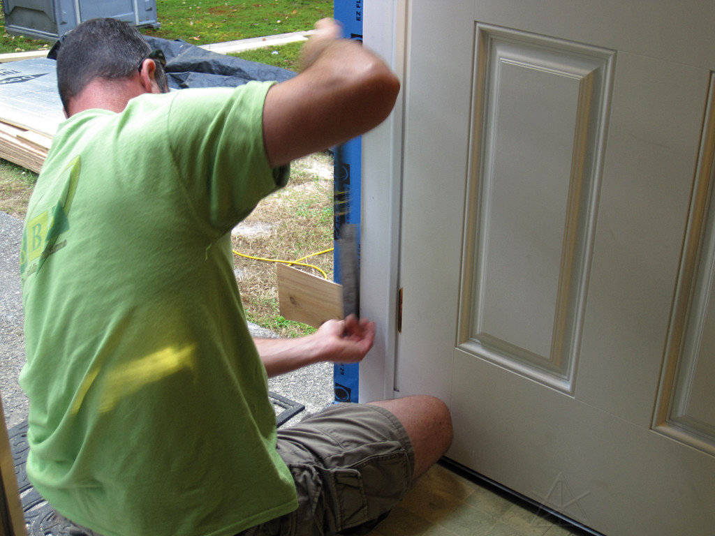 This frame got a proper set of shims to position it. It takes a bit of tweaking on those to get everything level, plumb, and square and then hope nothing shifts during later steps. |