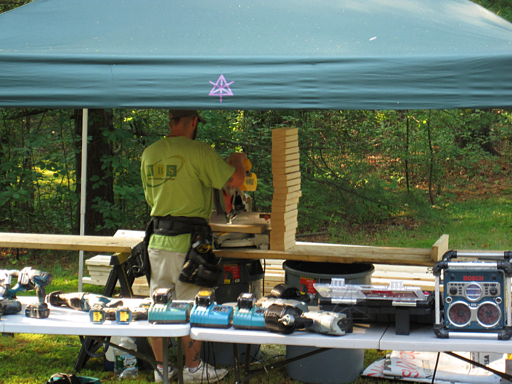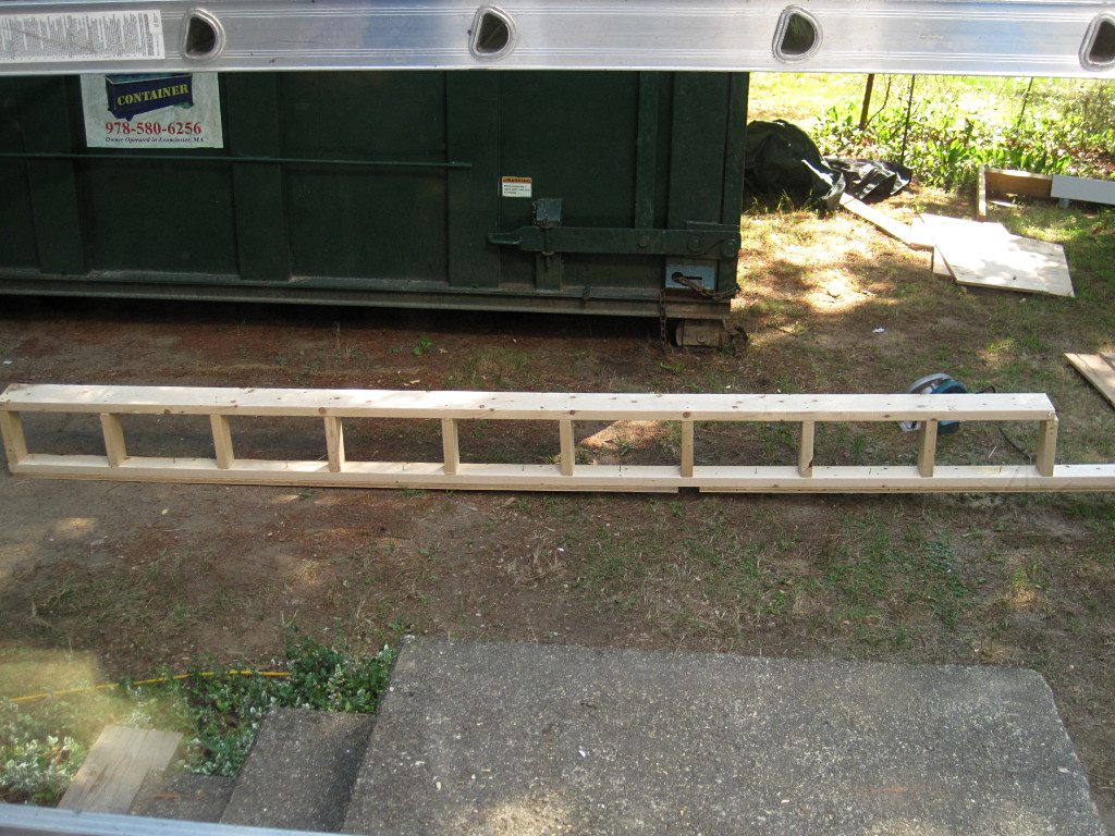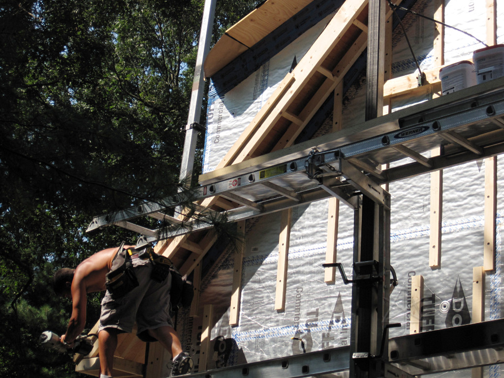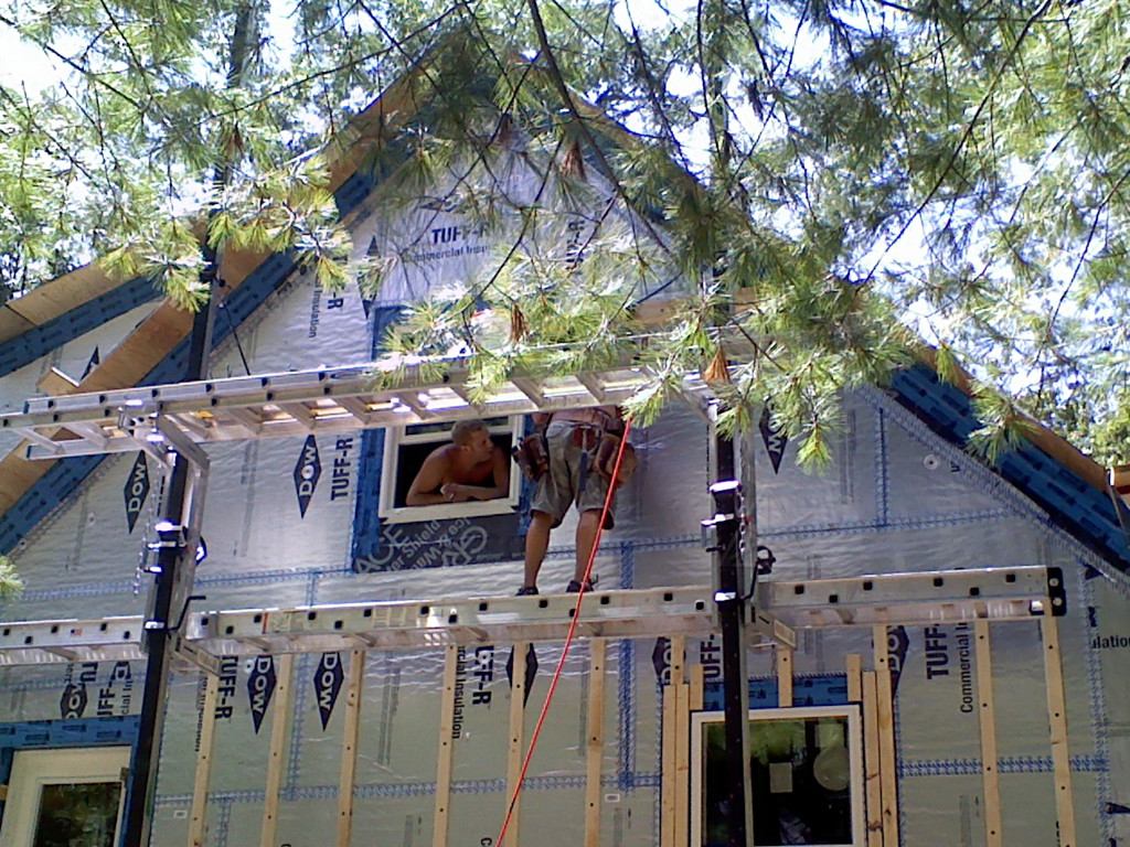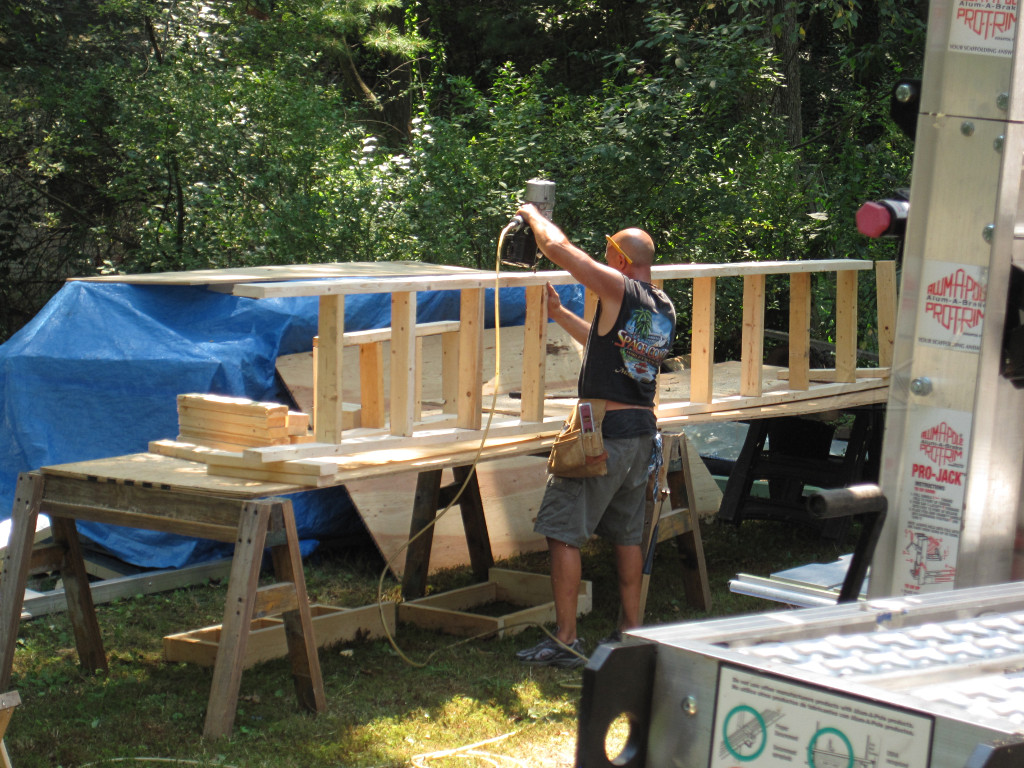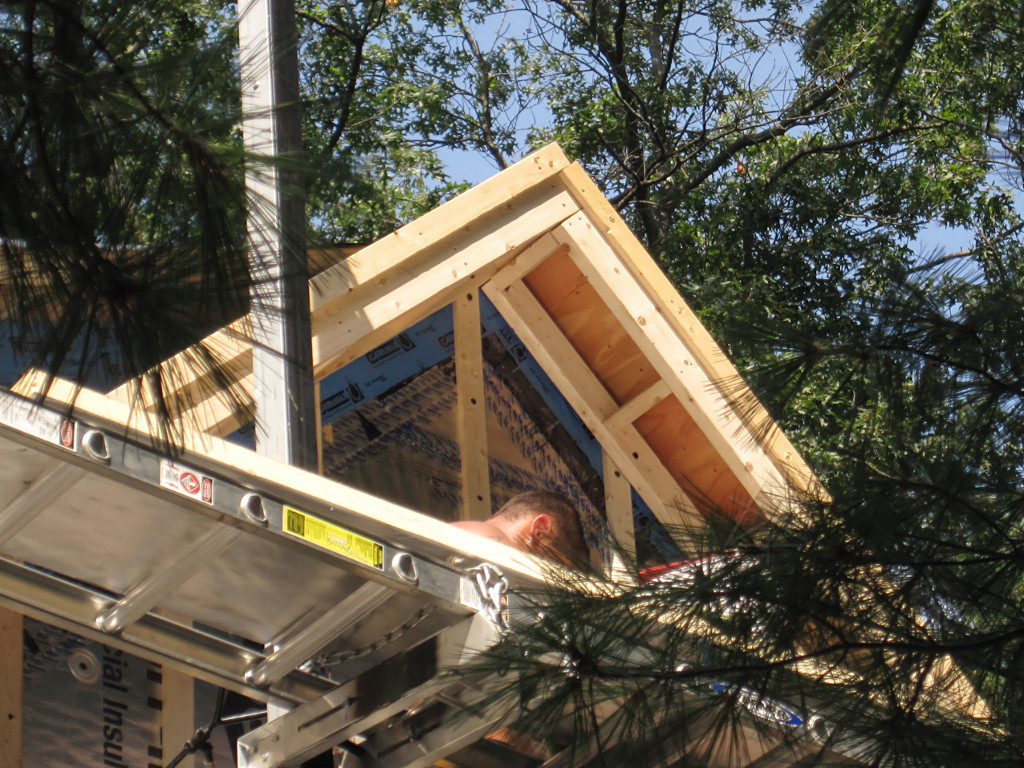 They moved around to the front, and the guy building the ladders had the first half of the large front overhang ready for them. |