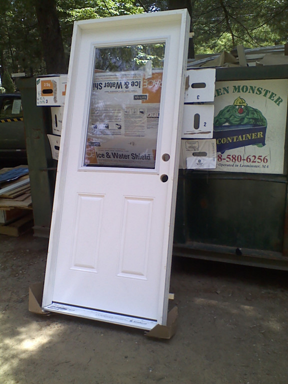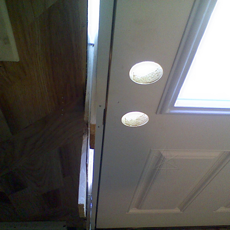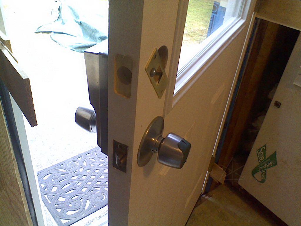 The nominally "fiberglass" door unit turned out to be fiberglass cladding over a wood and foam core, with the cross section clearly visible in the lock holes. This didn't appear to be an actual ThermaTru door like we had talked about getting ... in fact it didn't seem to carry any particular brand at all, and may have been simply assembled in Maki's shop from disparate parts. The sill had a shipping protector labeled "Endura Products" on it, and the hinge edge of the door itself said "Masonite". At least researching the latter turned up a chart that implied a U-factor of 0.28 [aka R-3.5] for this one -- not great, but probably on par with the old one which *was* a ThermaTru. At least this one's window was double-pane, but not filled with any exotic gas mix. |