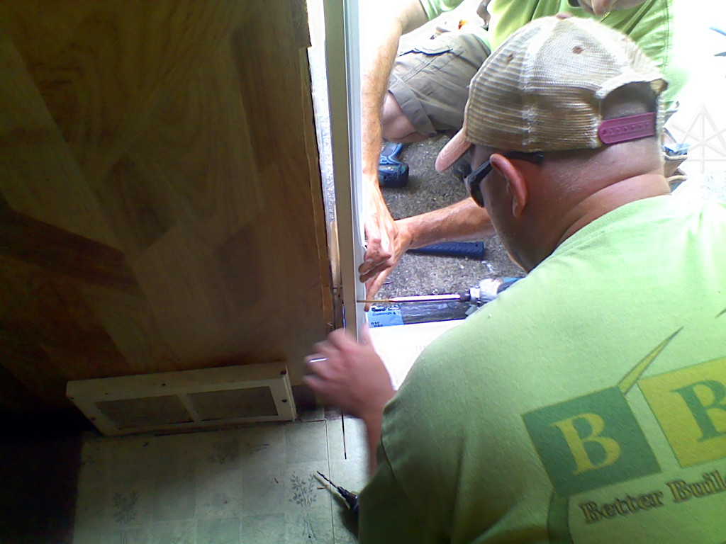 A couple of guys pulled the hunk of plywood off the side opening and got started on installing the door. A metal sill pan definitely went in here, no mystery pictures this time. |
