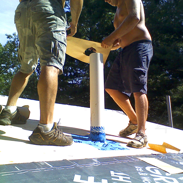 Once the ply was down, *more* flashing went on around the pipe as the Grace was rolled out across the completed over-deck. |