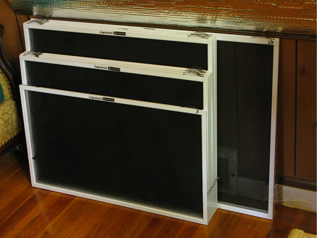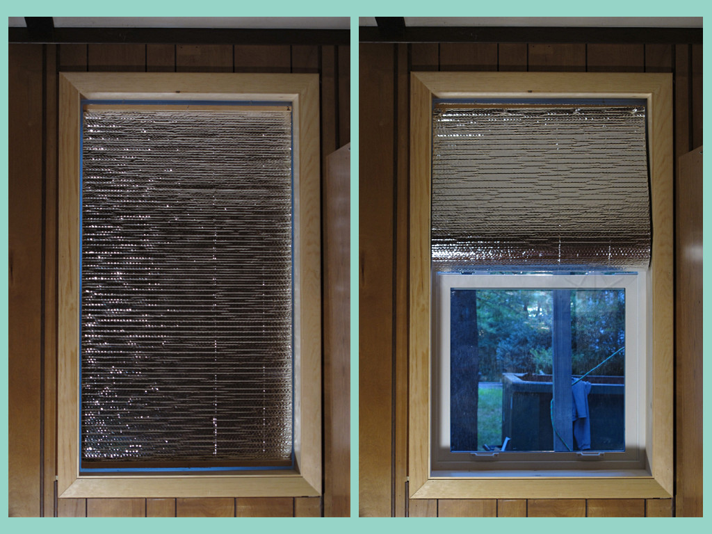 To generate a uniform set of blinds for all the windows, I had landed on the idea of using a type of mylar-coated thin bubble-wrap called Reflectix. I found it at Orangeco in various size rolls while just browsing around the insulation department seeking further education and something to take my mind off the fact that mainstream window-dressing is *stupidly* expensive. After a little experimenting and fit-figuring I came up with a method to make the same kind of shade for every window, and the more I worked on it the more I liked the concept. About halfway through the build process I posted a message about it to the homeowners' list. Once they were done I could gleefully huck all those old ratty drapes and curtain-rods I had taken down right into the dumpster. |