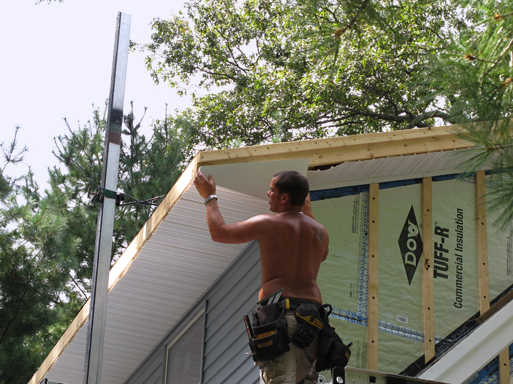 | It was almost kind of surreal to realize we were nearing the end of this part of the job. I had been referring to the ongoing project to friends as "a month-plus of burly guys pounding the crap out of my house, and I haven't freaked out yet -- well, except for the night the roof was leaking". Well, even that turned out to be relatively minor and fixable -- still very important, as one downside of this type of assembly is that unknown leaks could remain hidden for *years* before becoming evident, by which time extensive damage might already be done. Much would depend on the roofer's eventual performance, but obviously everyone needs to do their part in getting the critical details right. |