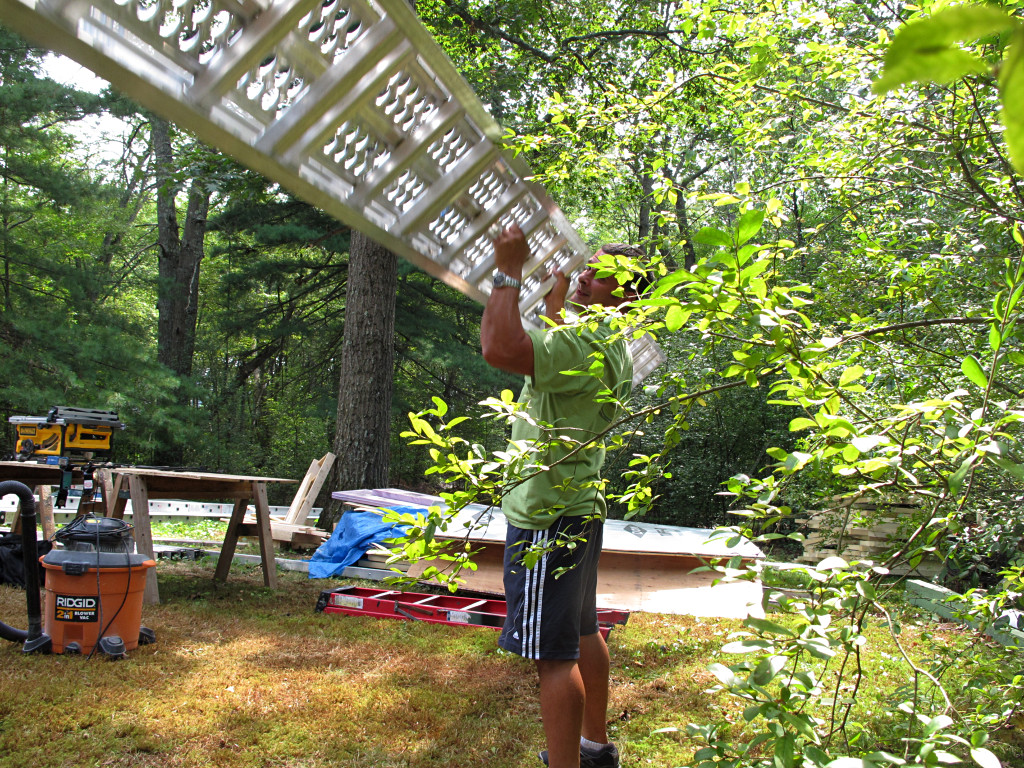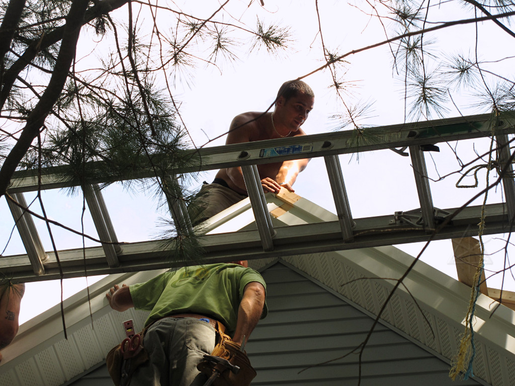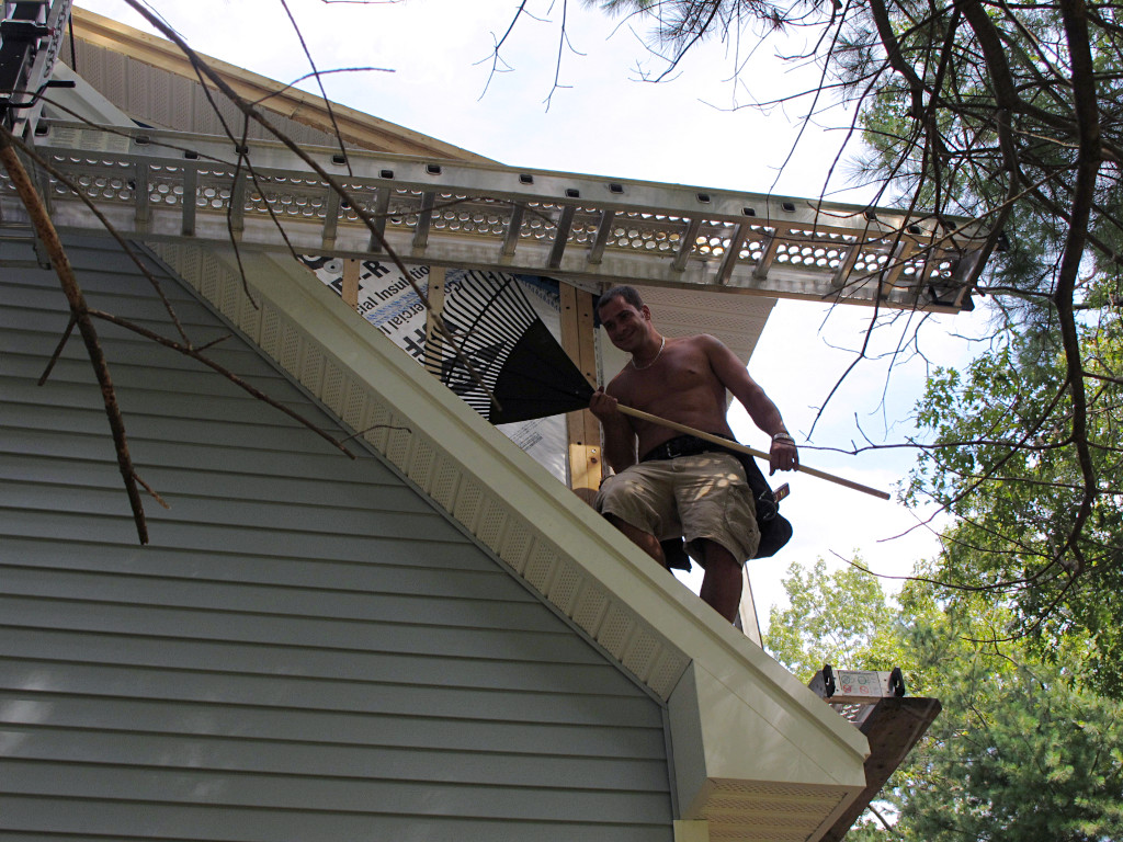 The one-legged carpenter was due to the fact that he was up there patching some remaining cleat and bracket holes in the roof Grace. |